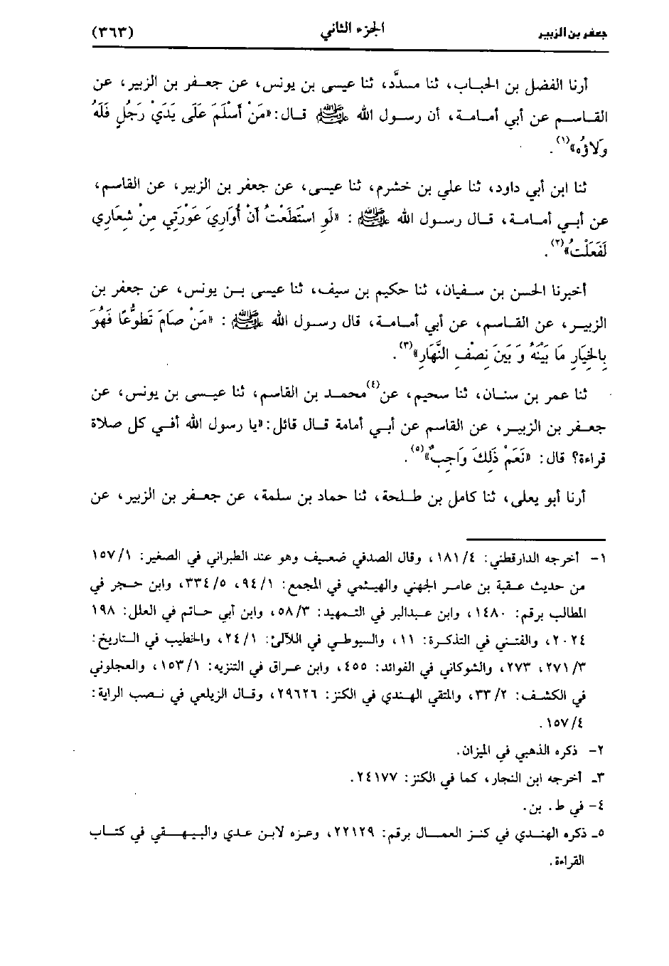 حَدَّثَنَا عُمَر بْنُ سِنَانٍ، حَدَّثَنا سُحَيْمٌ عَنْ مُحَمد بْنِ الْقَاسِمِ، حَدَّثَنا عِيسَى بْنُ يُونُس عَنْ جَعْفَرِ بْنِ الزُّبَيْرِ، عَنِ الْقَاسِمِ، عَن أَبِي أُمَامَةَ قَالَ قَائِلٌ يَا رَسُولَ اللهِ أَفِي كُلِّ صَلاةٍ قِرَاءَةٌ؟ قَال: نَعم ذَلِكَ واجب.