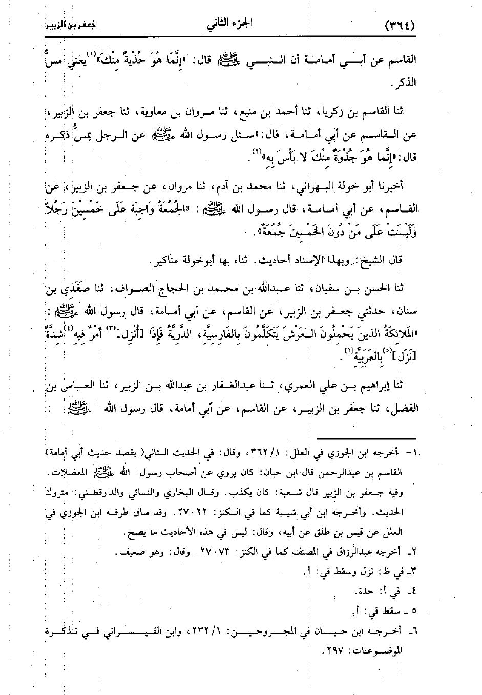 حَدَّثَنَا الْقَاسِمُ بْنُ زَكَرِيَّا، حَدَّثَنا أحمد بن منيع حَدَّثَنا مروان بن معاوية، حَدَّثَنا جَعْفَرِ بْنِ الزُّبَيْرِ، عَنِ الْقَاسِمِ، عَن أَبِي أُمَامَةَ قَالَ سُئِلَ رَسُولِ اللَّهِ صَلَّى اللَّهُ عَلَيْهِ وَسَلَّمَ عَنِ الرَّجُلِ يَمَسُّ ذَكَرَهُ قَالَ إِنَّمَا هُوَ جُذْوَةٌ مِنْكَ لا بأس به.