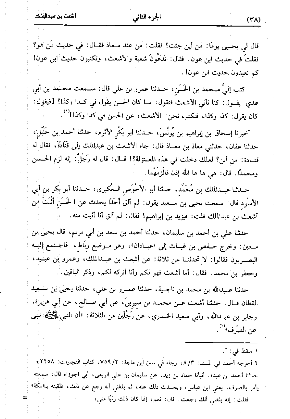 حَدَّثَنَا إِسْحَاقُ بْنُ إِبْرَاهِيمَ بْنُ يُونُس، حَدَّثَنا أبو بكر الأثرم، حَدَّثَنا أحمد بن حنبل، حَدَّثَنا عَفَّانُ، حَدَّثني مُعَاذُ بْنُ مُعَاذٍ قَالَ: جَاء الأَشْعَثُ بْنُ عَبد الْمَلِكِ إِلَى قَتَادَةَ فَقَالَ لَهُ قَتَادَةُ مِنْ أَيْنَ لَعَلَّكَ دَخَلْتَ فِي هَذِهِ الْمُعْتَزِلَةِ، قَال: قَال لَهُ رَجُلٌ إِنَّهُ لَزِمَ الْحَسَنَ وَمُحَمَّدًا قَالَ هِيَ هَا هَا الله إذا فَالْزِمْهُمَا.