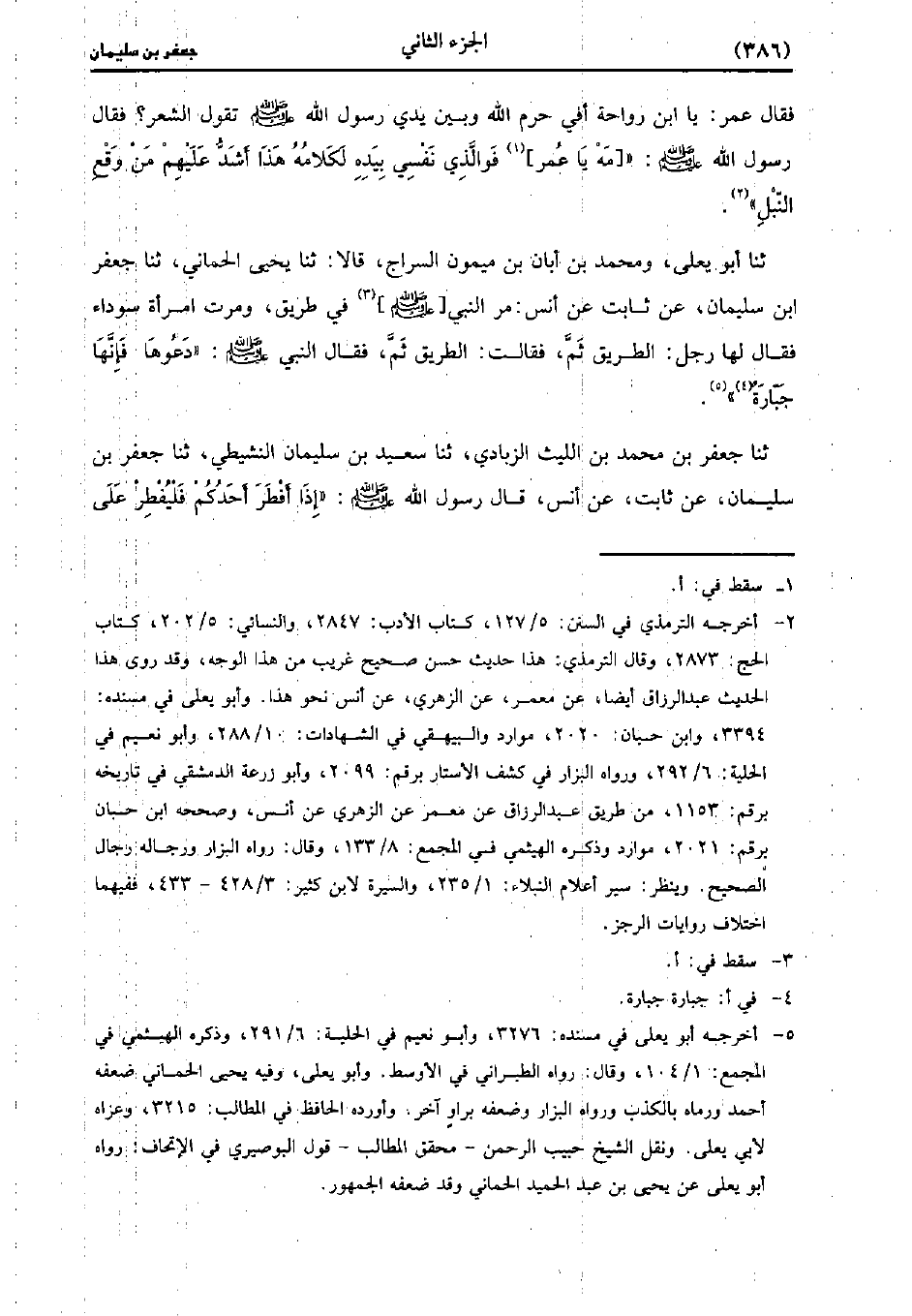 حَدَّثَنَا أَبُو يَعْلَى، وَمُحمد بْنُ أَبَان بْنِ مَيْمُونٍ السَّرَّاجُ، قَالا: حَدَّثَنا يَحْيى الحماني، حَدَّثَنا جَعْفَرُ بْنُ سُلَيْمَانَ عَنْ ثَابِتٍ، عَن أَنَس مَرَّ النَّبِيُّ صَلَّى اللَّهُ عَلَيهِ وَسلَّمَ فِي طَرِيقٍ وَمَرَّتِ امْرَأَةٌ سَوْدَاءُ فَقَالَ لَهَا رَجُلٌ الطَّرِيقُ ثَمَّ فَقَالَتْ الطَّرِيقُ ثَمَّ فَقَالَ النَّبِيُّ صَلَّى اللَّهُ عَلَيهِ وَسلَّمَ دَعُوهَا فَإِنَّهَا جَبَّارَةٌ.