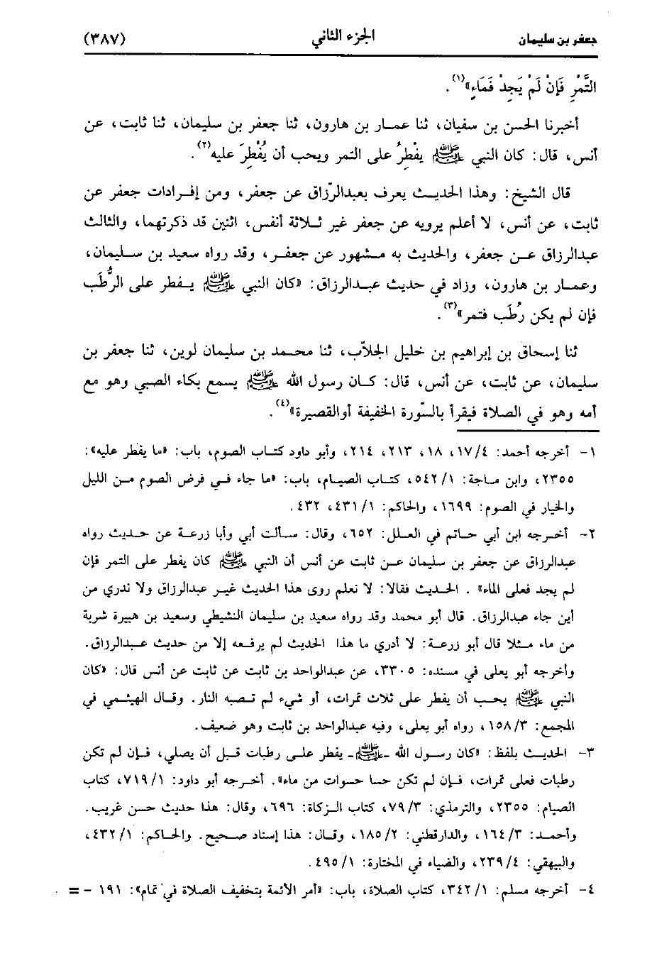 قَالَ الشَّيْخُ: وهذا الْحَدِيث يعرف بعبد الرَّزَّاق عَن جَعْفَر ومن إفرادات جَعْفَر عن ثابتعن أَنَسٍ لا أعلم يرويه عَن جَعْفَر غير ثلاثة أنفس اثنين قد ذكرتهما والثالث عَبد الرَّزَّاق عَن جَعْفَر والحديث به مشهور عَن جَعْفَر وقد رواه سَعِيد بْن سُلَيْمَان وعمار بْن هارون وزاد فِي حديث عَبد الرَّزَّاق كَانَ النَّبِيُّ صَلَّى اللَّهُ عَلَيهِ وَسلَّمَ يفطر عَلَى الرطب فإن لم يكن رطب فتمر.