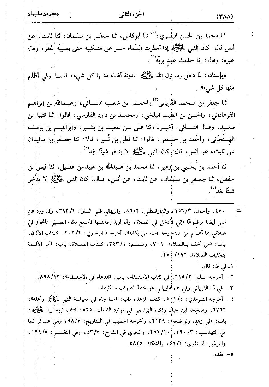 حَدَّثَنَا جعفر بن مُحَمد الفاريابي وَأَحْمَدُ بْنُ شُعَيب النَّسَائِيُّ، وَعَبد اللَّهِ بْنُ إِبْرَاهِيمَ الْفَرْهَاذَانِيُّ وَالْحَسَنُ بْنُ الطَّيِّبِ الْبَلْخِيُّ، وَمُحمد بْنُ داود الفارسي قالوا، حَدَّثَنا قُتَيْبَةُ بْنُ سَعِيد وَقَالَ النَّسَائِيُّ، أَخْبَرنا وَحَدَّثنا عَلِيُّ بْنُ سَعِيد بْنِ بَشِيرٍ وَإِبْرَاهِيمُ بْنُ يُوسُفَ الْهِسِنْجَانِيُّ وأحمد بن حفص قالوا، حَدَّثَنا قطن بن نسير، قالا: حَدَّثَنا جَعْفَرُ بْنُ سُلَيْمَانَ عَنْ ثَابِتٍ، عَن أَنَس، قَال: كَانَ النَّبِيُّ صَلَّى اللَّهُ عَلَيهِ وَسلَّمَ: لاَ يدخر شيئا لغد.