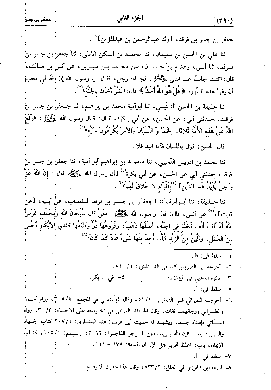 حَدَّثَنَا عَلِيُّ بْنُ الْحَسَنِ بْنِ سليمان، حَدَّثَنا مُحَمد بْنُ السَّكَنِ الأُبَلِِّيُّ، حَدَّثَنا جَعْفَر بْن جسر بْن فرقد، حَدَّثَنا أَبِي، وهِشام بْنُ حَسَّانٍ عَنْ مُحَمد بْنُ سِيرِين، عَن أَنَس بْنِ مَالِكٍ قَال: كنتُ جَالِسًا عِنْدَ النَّبِيِّ صَلَّى اللَّهُ عَلَيهِ وَسلَّمَ فَجَاءَهُ رَجُلٌ، فَقَالَ، يَا رَسُولَ اللهِ إِنَّ أَخًا لِي يُحِبُّ أَنْ يَقْرَأَ هَذِهِ السُّورَةَ {قُلْ هُوَ اللَّهُ أَحَدٌ} قَالَ بشر أخاك بالجنة.