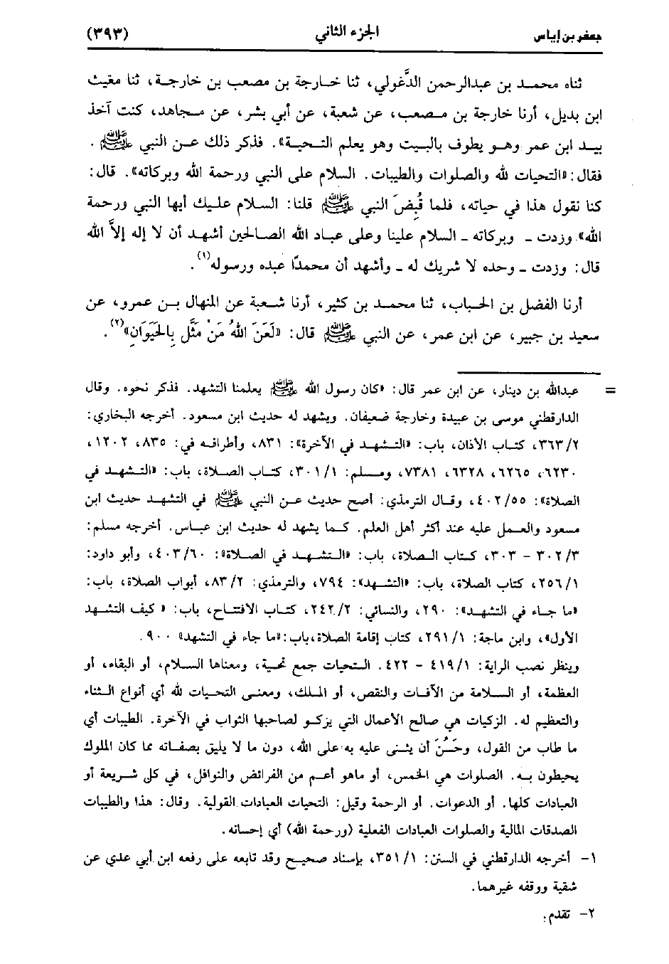 حَدَّثَنَاهُ مُحَمد بْنُ عَبد الرَّحْمَنِ الدَّغُولِيُّ، حَدَّثَنا خَارِجَةُ بْنُ مُصْعَبِ بْنِ خَارِجَةَ، حَدَّثَنا مغيث بن بديل أخبرنا خَارِجَةُ بْنُ مُصْعَبٍ عَنْ شُعْبَة، عَن أَبِي بِشْرٍ عَنْ مُجَاهِدٍ كُنْتُ آخِذٌ بِيَدِ ابْنِ عُمَر، وَهو يَطُوفُ بِالْبَيْتِ، وَهو يَعْلَمُ التَّحِيَّةَ فَذَكَرَ ذَلِكَ عَنِ النَّبِيِّ صَلَّى اللَّهُ عَلَيهِ وَسلَّمَ فَقَالَ التَّحِيَّاتُ لِلَّهِ وَالصَّلَوَاتُ وَالطَّيِّبَاتُ السَّلامُ عَلَى النَّبِيِّ وَرَحْمَةُ اللَّهِ وَبَرَكَاتُهُ قَال: كُنا نَقُولُ هَذَا فِي حَيَاتِهِ فَلَمَّا قُبِضَ النَّبِيُّ صَلَّى اللَّهُ عَلَيهِ وَسلَّمَ قُلْنَا السَّلامُ عليك أيه النَّبِيُّ وَرَحْمَةُ اللَّهِ وَزِدْتُ وَبَرَكَاتُهُ السَّلامُ عَلَيْنَا وَعَلَى عِبَادِ اللَّهِ الصَّالِحِينَ أَشْهَدُ أَنْ لا إِلَهَ إِلا اللَّهُ قَالَ وَزِدْتُ وَحْدَهُ لا شَرِيك لَهُ وَأَشْهَدُ أَنَّ محمدا عبده ورسوله.