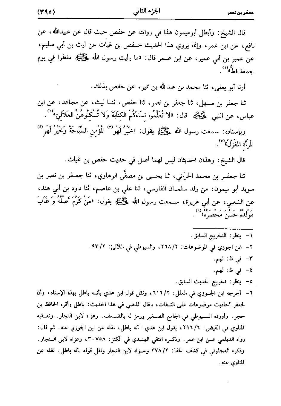 قَالَ الشَّيْخُ: وأبطل أَبُو ميمون هَذَا فِي روايته عَن حفص حيث قَالَ عَن عُبَيد اللَّه عَنْ نَافِعٍ، عنِ ابْنِ عُمَر، وإِنَّما يروي هَذَا الْحَدِيث حفص بْن غياث عَن لَيْث بْن أبِي سُلَيم عَن عُمَير بْن أَبِي عُمَير، عنِ ابْن عُمَر قَال: مَا رأيتُ رَسُولَ اللَّهِ صَلَّى اللَّهُ عَلَيْهِ وَسَلَّمَ مُفْطِرًا في يوم جمعة قط.