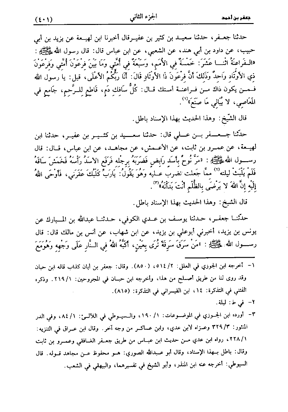 حَدَّثَنَا جَعْفَرٌ، حَدَّثَنا سَعِيد بْنُ كَثِيرِ بْنِ عُفَيْرٍ، قَال: أَخْبَرنا بن لَهِيعَة عَنْ يَزِيدَ بْنِ أَبِي حَبِيبٍ عَنْ دَاوُدَ بْنِ أَبِي هِنْدٍ عَنِ الشَّعْبِيِّ، عنِ ابْنِ عَبَّاسٍ، قَال: قَال رَسُولُ اللَّهِ صَلَّى اللَّهُ عَلَيْهِ وَسَلَّمَ الْفَرَاعِنَةُ اثْنَا عَشَرَ خَمْسَةٌ فِي الأُمَمِ وَسَبْعَةٌ فِي أُمَّتِي وَمَا بَيْنَ فِرْعَوْنَ أُمَّتِي وَفِرْعَوْنَ ذِي الأَوْتَادِ وَاحِدٌ وَذَلِكَ أَنَّ فِرْعَوْنَ ذَا الأَوْتَادِ قَالَ أَنَا رَبُّكُمُ الأَعْلَى قِيلَ يَا رَسُولَ اللهِ فَمَنْ يَكُونُ ذَاكَ مِنْ فَرَاعِنَةِ أُمَّتِكَ قَالَ كُلُّ سَافِكِ دَمٍ قَاطِعٍ لِلرَّحِمِ جَامِعٍ فِي الْمَعَاصِي لا يُبَالِي مَا صَنَعَ.