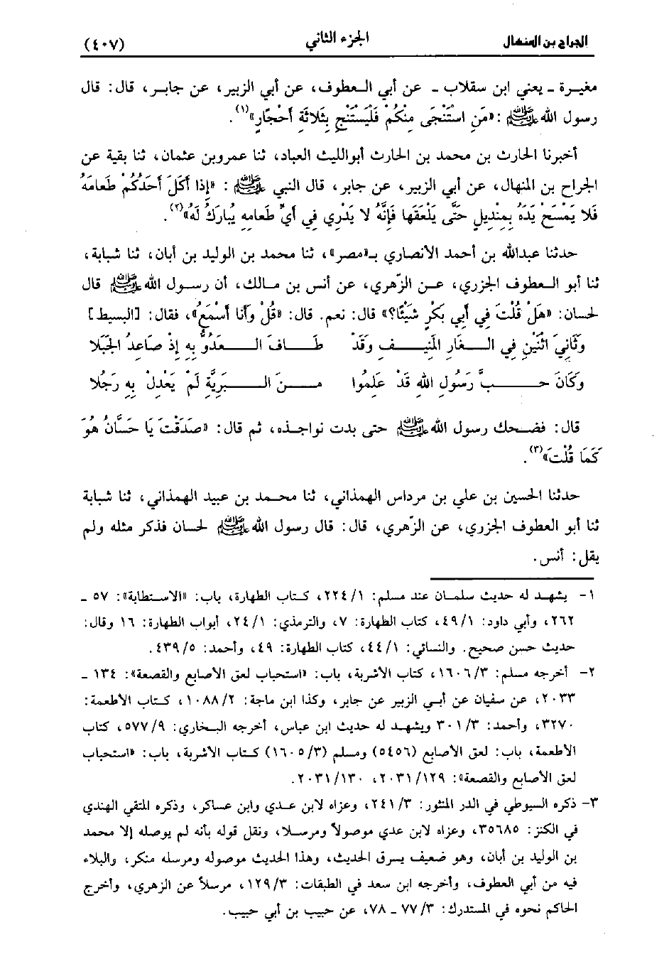 مُغِيرَةُ يَعني ابْنَ سِقْلابٍ، عَن أَبِي الْعَطُوفِ، عَن أَبِي الزُّبَيْرِ عَنْ جَابِرٍ، قَال: قَال رَسُولُ اللَّهِ صَلَّى اللَّهُ عَلَيْهِ وَسَلَّمَ مَنِ اسْتَنْجَى مِنْكُمْ فَلْيَسْتَنْجِ بِثَلاثَةِ أحجار.