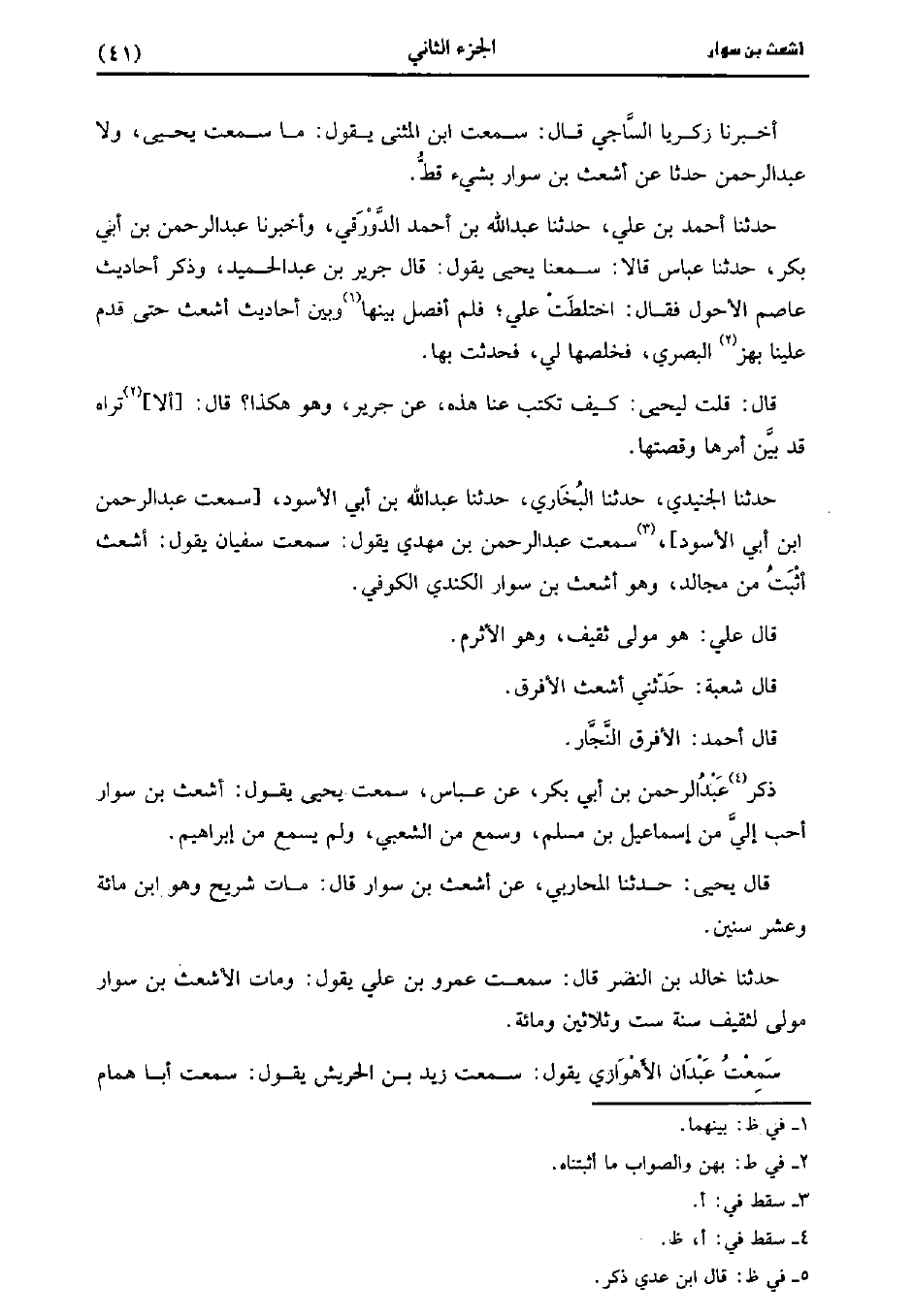 حَدَّثَنَا الجنيدي، حَدَّثَنا البُخارِيّ، حَدَّثني عَبد اللَّهِ بْن أَبِي الأسود سَمِعْتُ عَبد الرَّحْمَنِ بْن أَبِي الأسود سَمِعْتُ عَبد الرَّحْمَنِ بْن مهدي يَقُولُ: سَمعتُ سفيان يَقُولُ أَشْعَث أثْبَتُ من مجالد، وَهو أَشْعَث بْن سوار الكندي الْكُوفِيّ.