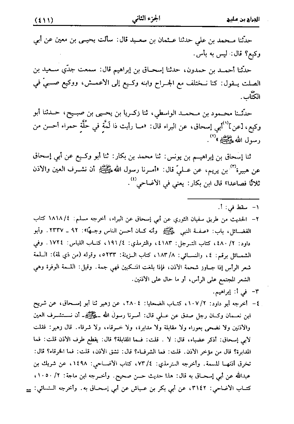 حَدَّثَنَا مَحْمُودُ بْنُ مُحَمد الْوَاسِطِيُّ، حَدَّثَنا زَكَرِيَّا بْنُ يَحْيى بْنِ صُبَيْحٍ، حَدَّثَنا أَبُو وَكِيعٍ، عَن أَبِي إِسْحَاقَ عَنِ الْبَرَاءِ قَال: مَا رأيتُ ذَا لَمَّةٍ فِي حُلَّةٍ حَمْرَاءَ أَحْسَنَ مِنْ رَسُولِ اللَّهِ صَلَّى اللَّهُ عَلَيْهِ وَسَلَّمَ.