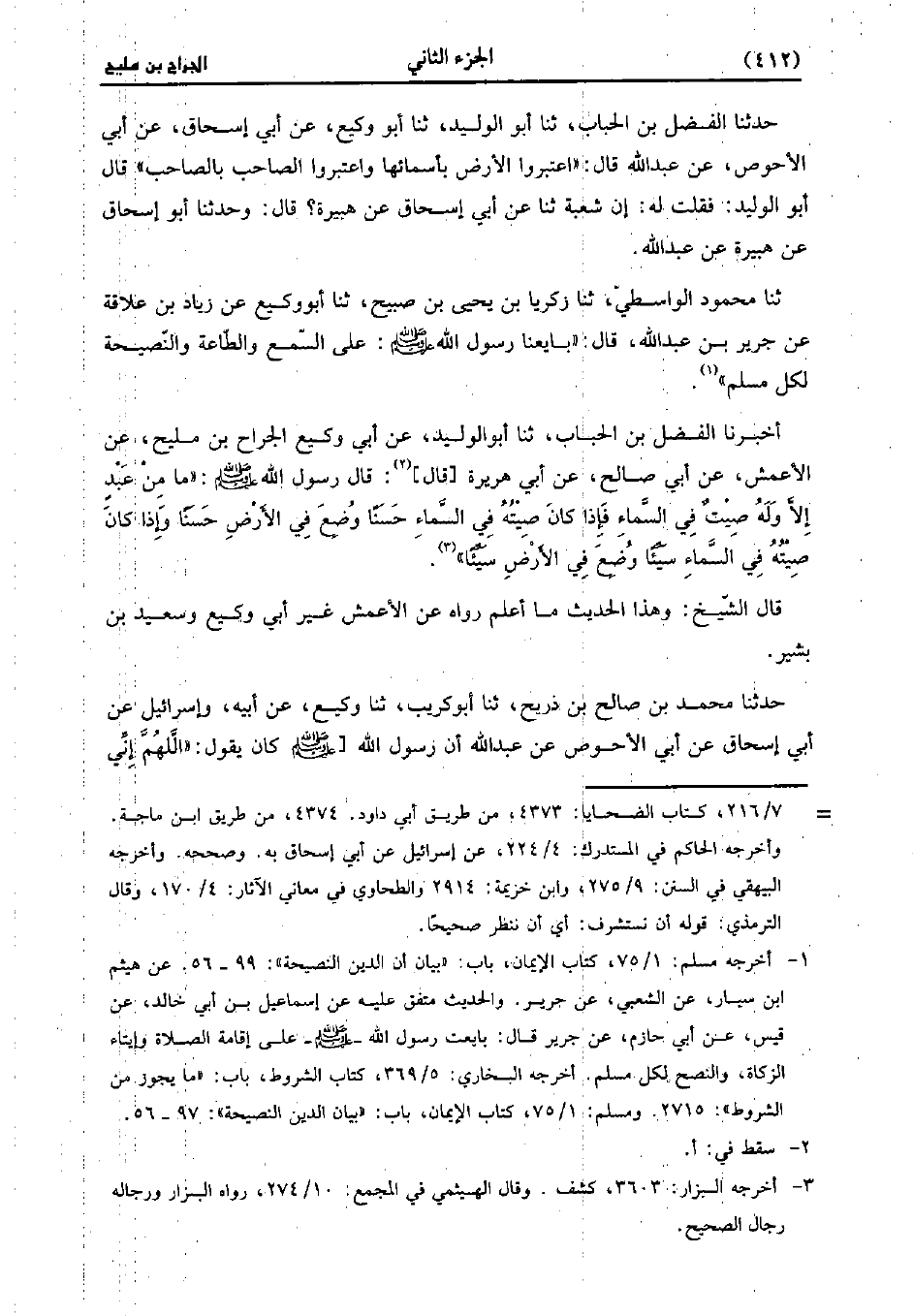 حَدَّثَنَا محمود الْوَاسِطِيُّ، حَدَّثَنا زَكَرِيَّا بْنُ يَحْيى بْنِ صُبَيْحٍ، حَدَّثَنا أَبُو وَكِيعٍ عَنْ زِيَادِ بْنِ عِلاقَةَ عَنْ جَرِيرِ بْنِ عَبد اللَّهِ قَالَ بَايَعْنَا رَسُولَ اللَّهِ صَلَّى اللَّهُ عَلَيْهِ وَسَلَّمَ عَلَى السَّمْعِ وَالطَّاعَةِ والنصيحة لكل مسلم.