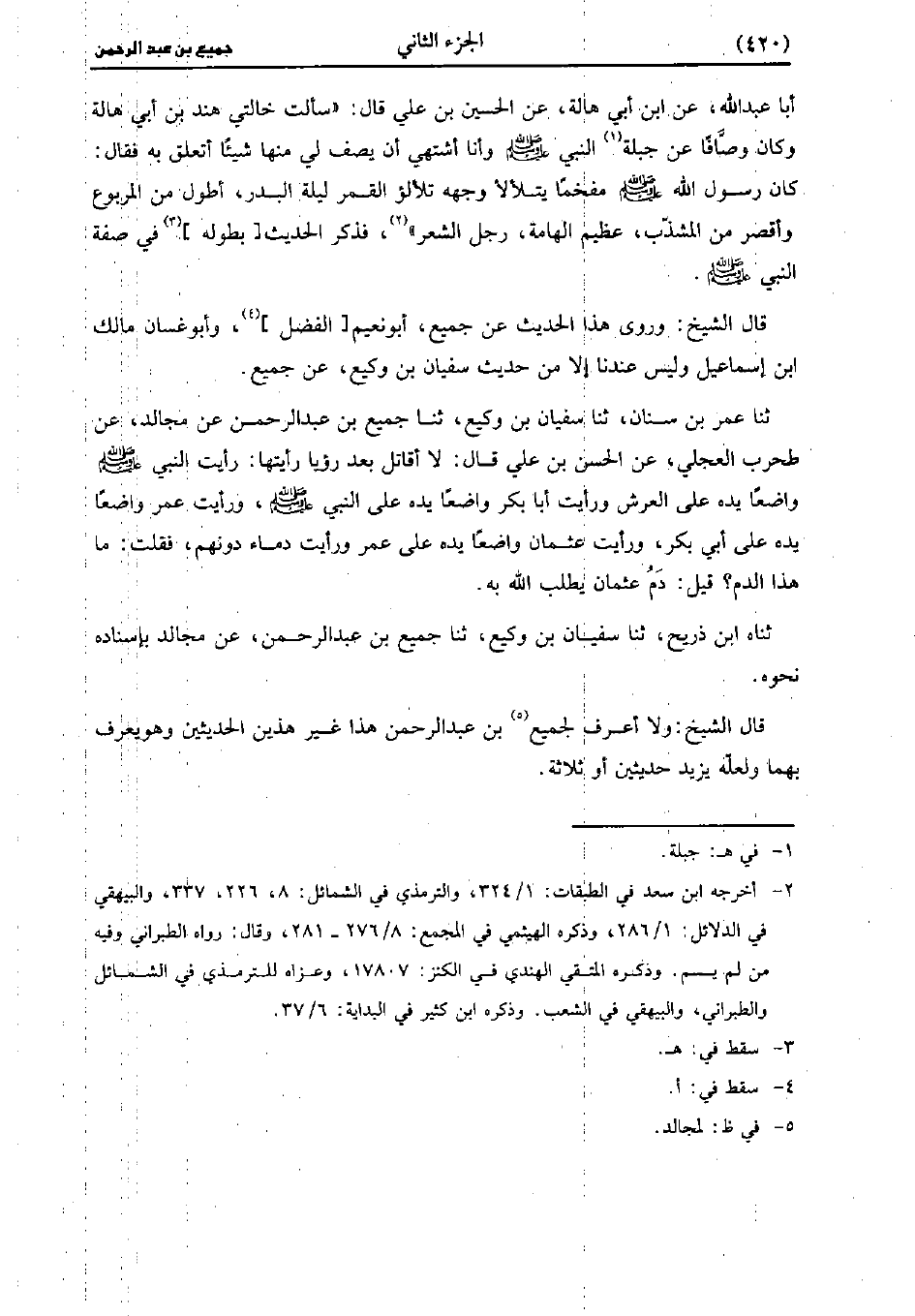 أَبَا عَبد اللَّهِ، عنِ ابْنِ لأبي هَالَةَ عَنِ الْحُسَيْنِ بْنِ عَلِيٍّ، قالَ: سَألتُ خالتي هِنْدَ بْنَ أَبِي هَالَةَ وَكَانَ وصافا عن حلية النَّبِيُّ صَلَّى اللَّهُ عَلَيهِ وَسلَّمَ وَأَنَا أَشْتَهِي أَنْ يَصِفَ لِي مِنْهَا شَيْئًا أَتَعَلَّقُ بِهِ فَقَالَ: كَانَ رَسُولُ اللَّهِ صَلَّى اللَّهُ عَلَيْهِ وَسَلَّمَ فخما يَتَلأَلأُ وَجْهَهُ تَلأْلُؤَ الْقَمَرِ لَيْلَةَ الْبَدْرِ أَطْوَلَ مِنَ الْمَرْبُوعِ وَأَقْصَرَ مِنَ الْمُشَذَّبِ عَظِيمَ الْهَامَةِ رَجِلَ الشَّعْرِ فَذَكَرَ الْحَدِيثَ بِطُولِهِ فِي صفة النَّبِيّ صَلَّى اللَّهُ عَلَيهِ وَسلَّمَ.