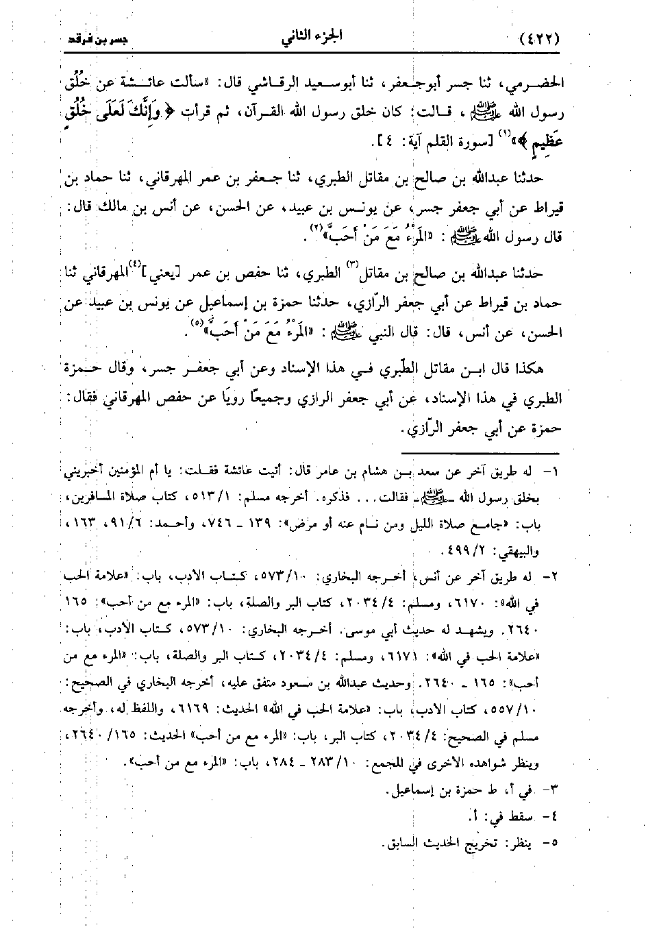 حَدَّثَنَا عَبد اللَّهِ بْنُ صَالِحٍ بن مقاتل الطبري، حَدَّثَنا جعفر بْنُ عُمَر الْمِهْرِقَانِيُّ، حَدَّثَنا حَمَّادُ بْنُ قِيرَاطٍ، عَن أَبِي جَعْفَرٍ جَسْرٍ عَنْ يُونُس بْنِ عُبَيد عَنِ الْحَسَنِ، عَن أَنَس بْنِ مَالِكٍ، قَال: قَال رَسُولُ اللَّهِ صَلَّى اللَّهُ عَلَيْهِ وَسَلَّمَ الْمَرْءُ مَعَ مَنْ أَحَبَّ.