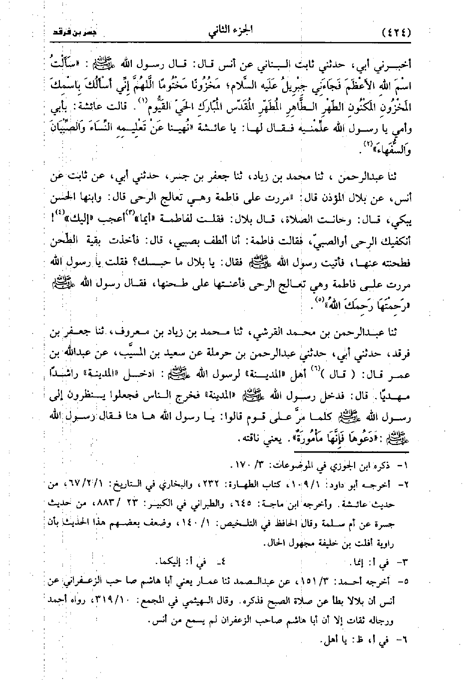 حَدَّثَنَا عَبد الرَّحْمَنِ، حَدَّثَنا مُحَمد بْنُ زياد، حَدَّثَنا جَعْفَرُ بْنُ جَسْرٍ، حَدَّثني أَبِي عَنْ ثَابِتٍ، عَن أَنَس عَنِ بِلالٍ الْمُؤَذِّنِ قَالَ مَرَرْتُ عَلَى فَاطِمَةَ وَهِيَ تُعَالِجُ الرَّحَى قَالَ وابنها الحسين يَبْكِي قَالَ وَحَانَتِ الصَّلاةُ قَالَ بِلالٌ فَقُلْتُ لِفَاطِمَةَ أَيُّمَا أَعْجَبُ إِلَيْكِ أَنَكْفِيكِ الرَّحَى أَوِ الْصَبِيَّ فَقَالَتْ فَاطِمَةُ أَنَا أَلْطَفُ بِصَبِيِّيِ قَالَ فَأَخَذْتُ بَقِيَّةَ الطَّحْنِ فَطَحَنْتُهُ عَنْهَا فَأَتَيْتُ رَسُولَ اللَّهِ صَلَّى اللَّهُ عَلَيْهِ وَسَلَّمَ، فَقَالَ، يَا بِلالُ مَا حَبَسَكَ فَقُلْتُ يَا رَسُولَ اللهِ مَرَرْتُ عَلَى فَاطِمَةَ وَهِيَ تُعَالِجُ الرَّحَى فَأَعَنْتُهَا عَلَى طَحْنِهَا فَقَالَ رَسُولُ اللَّهِ صَلَّى اللَّهُ عَلَيْهِ وَسَلَّمَ رَحِمْتَهَا رَحِمَكَ الله.