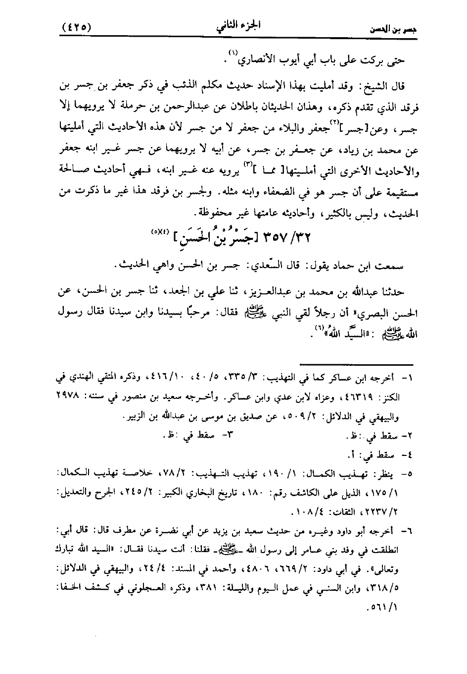 قَالَ الشَّيْخُ: وقد أمليت بهذا الإسناد حديث مكلم الذئب فِي ذكر جَعْفَر بْن جسر بْن فرقد الَّذِي تقدم ذكره وهذان الحديثان باطلان عَن عَبد الرَّحْمَنِ بْن حرملة لا يرويهما إلا جسر وعن جسر جَعْفَر والبلاء من جَعْفَر لا من جسر لأن هذه الأحاديث الَّتِي أمليتها عَن مُحَمد بْن زياد عَن جَعْفَر بْن جسر، عَن أَبِيهِ لا يرويها عَن جسر غير ابنه جَعْفَر والأحاديث الأخرى الَّتِي أمليتها مما يرويه عَنْهُ غير ابنه فهي أحاديث صالحة مستقيمة عَلَى أن جسر هُوَ فِي الضعفاء وابنه مثله ولجسر بْن فرقد هَذَا غير ما ذكرت من الْحَدِيث وليس بالكثير وأحاديثه عامتها غير محفوظة.