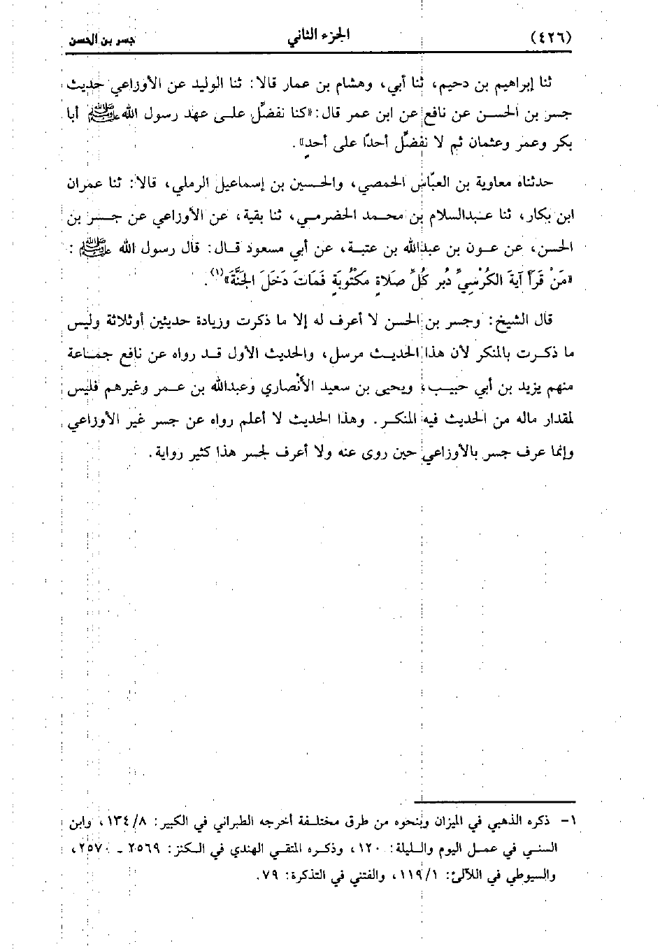 حَدَّثَنَا إبراهيم بن دحيم، حَدَّثَنا أَبِي، وهِشام بْنُ عَمَّارٍ، قَالا: حَدَّثَنا الْوَلِيدُ عَنِ الأَوْزاعِيّ حَدِيثَ جَسْرِ بْنِ الْحَسَنِ، عَن نَافِعٍ، عنِ ابن عُمَر قَال: كُنا نفصل عَلَى عَهْدِ رَسُولِ اللَّهِ صَلَّى اللَّهُ عَلَيْهِ وَسَلَّمَ أَبَا بَكْرٍ وَعُمَرَ وَعُثْمَانَ ثُمَّ لا نُفَضِّلُ أَحَدًا عَلَى أَحَدٍ.