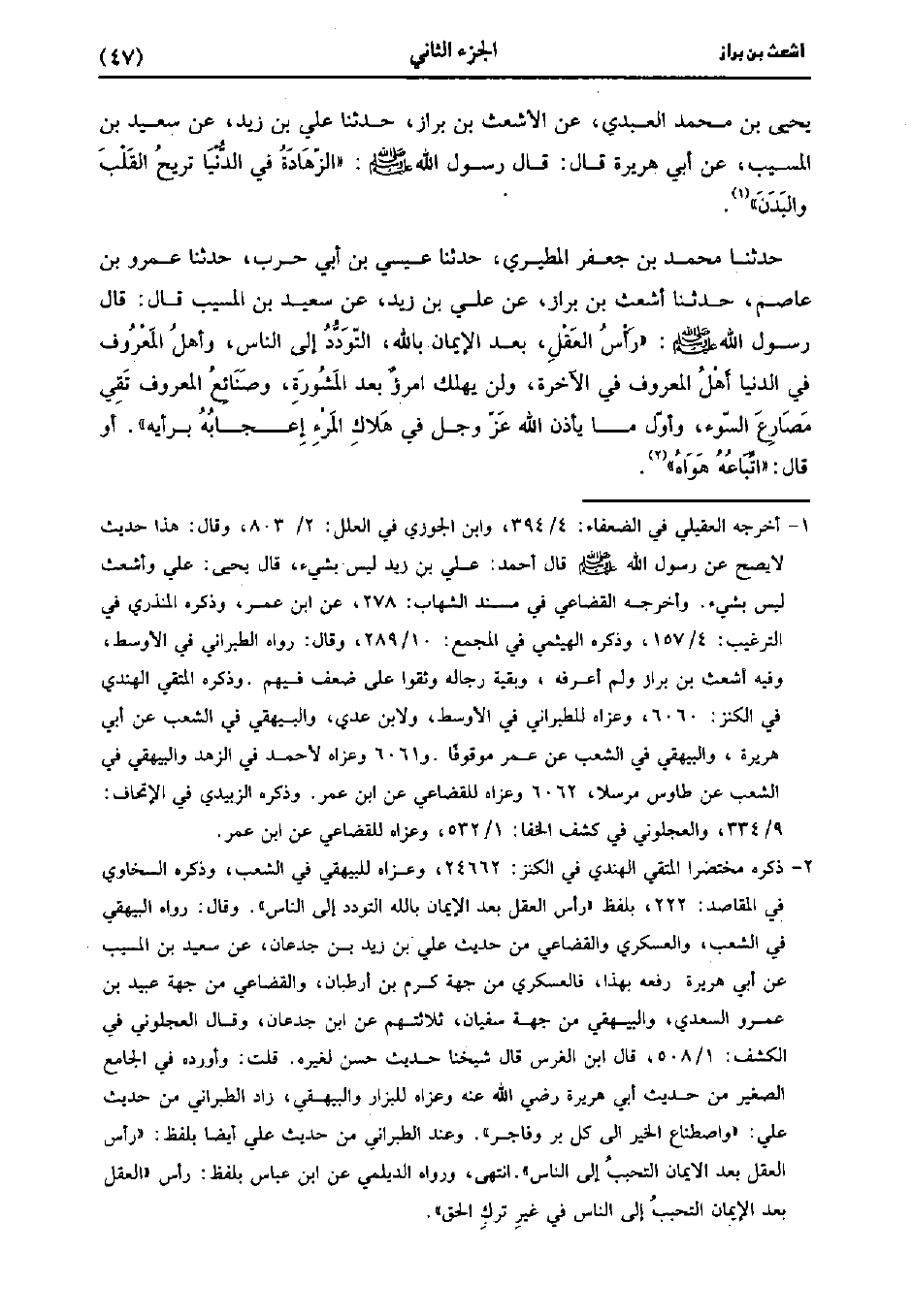 يَحْيى بْنُ مُحَمد الْعَبْدِيُّ عَنِ الأَشْعَثِ بْنِ بَرَازٍ، حَدَّثَنا عَلِيُّ بْنُ زَيْدٍ عَنْ سَعِيد بْنِ المُسَيَّب، عَن أَبِي هُرَيْرَةَ، قَال: قَال رَسُولُ اللَّهِ صَلَّى اللَّهُ عَلَيْهِ وَسَلَّمَ الزَّهَادَةُ فِي الدُّنْيَا تُرِيحُ الْقَلْبَ وَالْبَدَنَ.