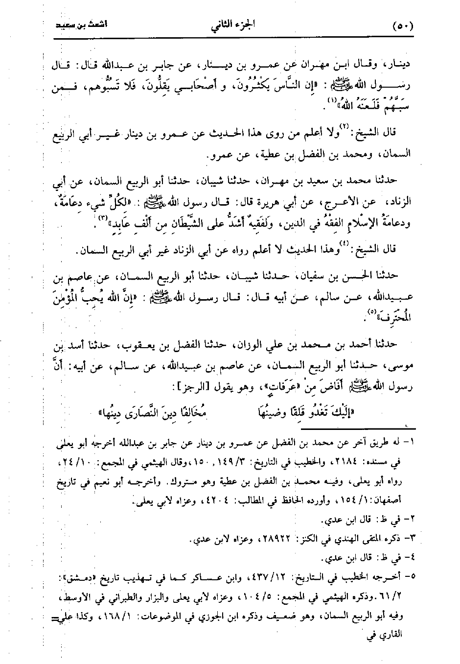 حَدَّثَنَا أَحْمَدُ بْنُ مُحَمد بْنِ عَلِيٍّ الْوَزَّانُ، حَدَّثَنا الْفَضْلُ بْنُ يَعْقُوبَ، حَدَّثَنا أَسَدُ بْنُ مُوسَى، حَدَّثَنا أَبُو الربيع السمان، عَن عاصم بْن عُبَيد اللَّهِ عَنْ سَالِمٍ، عَنْ أَبِيهِ، أَن رسُول اللَّهِ صَلَّى اللَّهُ عَلَيهِ وَسلَّمَ أَفَاضَ مِنْ عَرَفَاتٍ، وَهو يَقُولُ %إِلَيْكَ تَغْدُو قَلِقًا وَضِينُهَا %مُخَالِفًا دِينَ النَّصَارَى دينها%