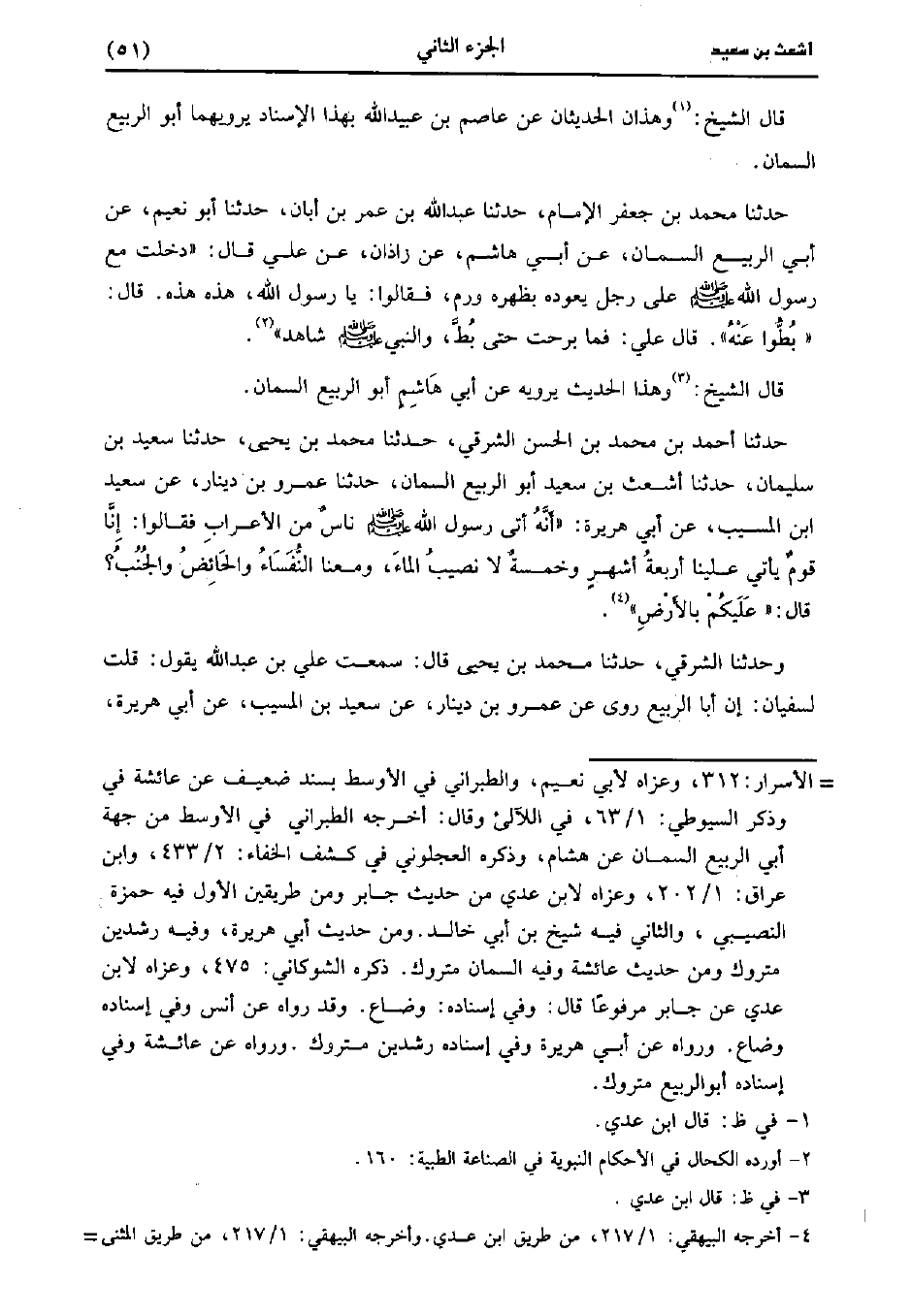 حَدَّثَنَا أَحْمَدُ بْنُ مُحَمد بْنِ الْحَسَنِ الشَّرْقِيُّ، حَدَّثَنا مُحَمد بْنُ يَحْيى، حَدَّثَنا سَعِيد بْنُ سُلَيْمَانَ، حَدَّثَنا أَشْعَثُ بْنُ سَعِيد أَبُو الرَّبِيعِ السَّمَّانُ، حَدَّثَنا عَمْرو بْنُ دِينَارٍ عَنْ سَعِيد بْنِ المُسَيَّب، عَن أَبِي هُرَيْرَةَ أَنَّهُ أَتَى رَسُولَ اللَّهِ صَلَّى اللَّهُ عَلَيْهِ وَسَلَّمَ نَاسٌ مِنَ الأَعْرَابِ فَقَالُوا إِنَّا قَوْمٌ يَأْتِي عَلَيْنَا أَرْبَعَةُ أَشْهُرٍ وَخَمْسَةٌ لا نُصِيبُ الْمَاءَ وَمَعَنَا النُّفَسَاءُ وَالْحَائِضُ والجنب قال عليكم بالأرض (ح) وَحَدَّثَنَا الشَّرْقِيُّ، حَدَّثَنا مُحَمد بْنُ يَحْيى، قَالَ: سَمِعْتُ عَلِيَّ بْنَ عَبد اللَّهِ يَقُولُ قُلْتُ لِسُفْيَانَ إِنَّ أَبَا الرَّبيِعِ رَوَى عَنْ عَمْرو بْنُ دِينَارٍ عَنْ سَعِيد بْنِ المُسَيَّب، عَن أَبِي هُرَيْرَةَ