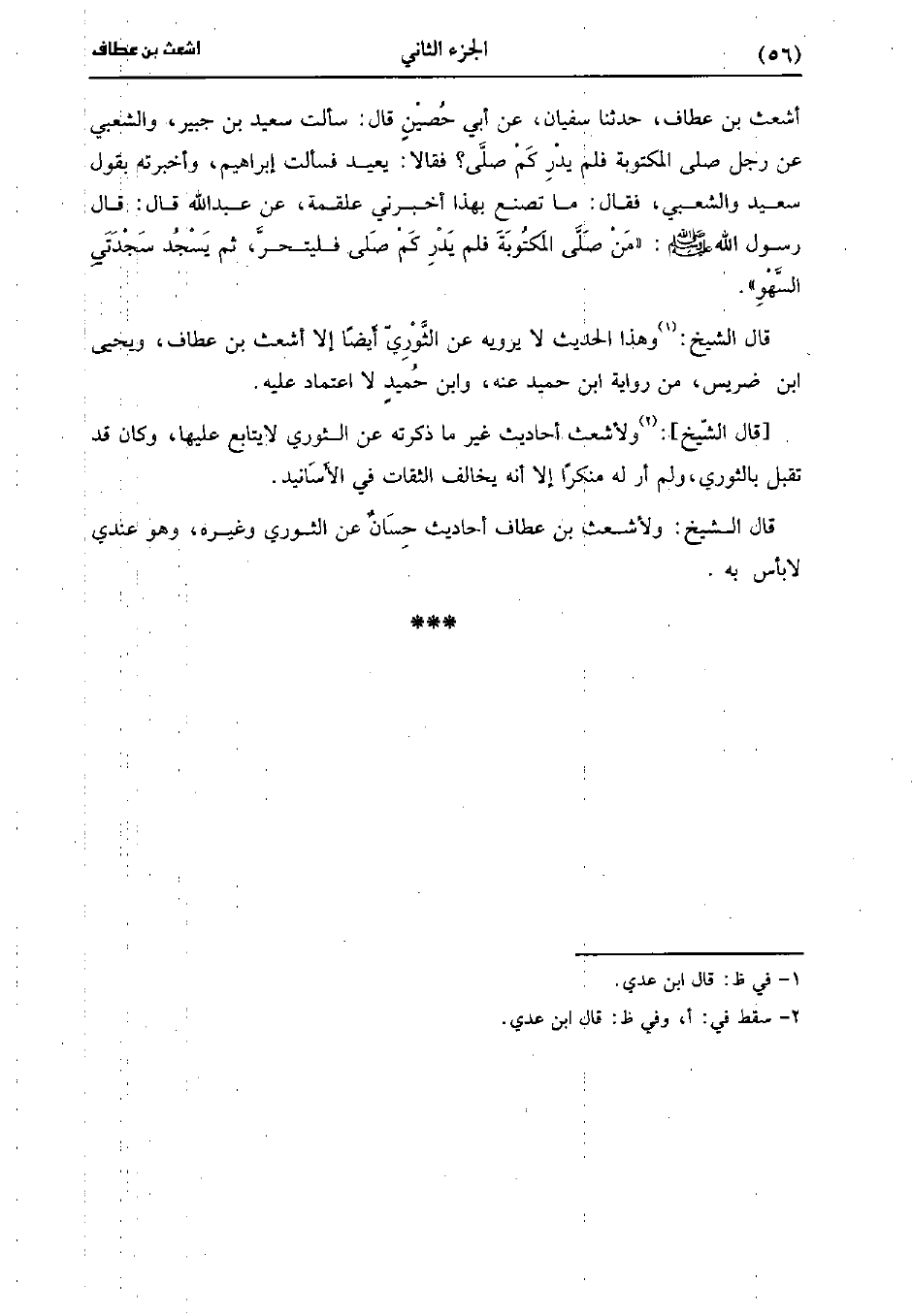 أَشْعَثُ بْنُ عَطَّافٍ، حَدَّثَنا سُفيان، عَن أَبِي حُصَيْنٍ، قالَ: سَألتُ سَعِيد بْنَ جُبَيْرٍ وَالشَّعْبِيَّ عَنْ رَجُلٍ صَلَّى الْمَكْتُوبَةَ فَلَمْ يَدْرِ كَمْ صَلَّى فَقَالا يُعِيدُ فَسَأَلْتُ إِبْرَاهِيمَ وَأَخْبَرْتُهُ بِقَوْلِ سَعِيد وَالشَّعْبِيِّ فَقَالَ مَا تَصْنَعُ بِهَذَا أَخْبَرَنِي عَلْقَمَةَ عَنْ عَبد اللَّهِ، قَال: قَال رَسُولُ اللَّهِ صَلَّى اللَّهُ عَلَيْهِ وَسَلَّمَ مَنْ صَلَّى الْمَكْتُوبَةَ فَلَمْ يَدْرِ كَمْ صَلَّى فَلْيَتَحَرَّ ثُمَّ يَسْجُدُ سَجْدَتَيِ السَّهْوِ.