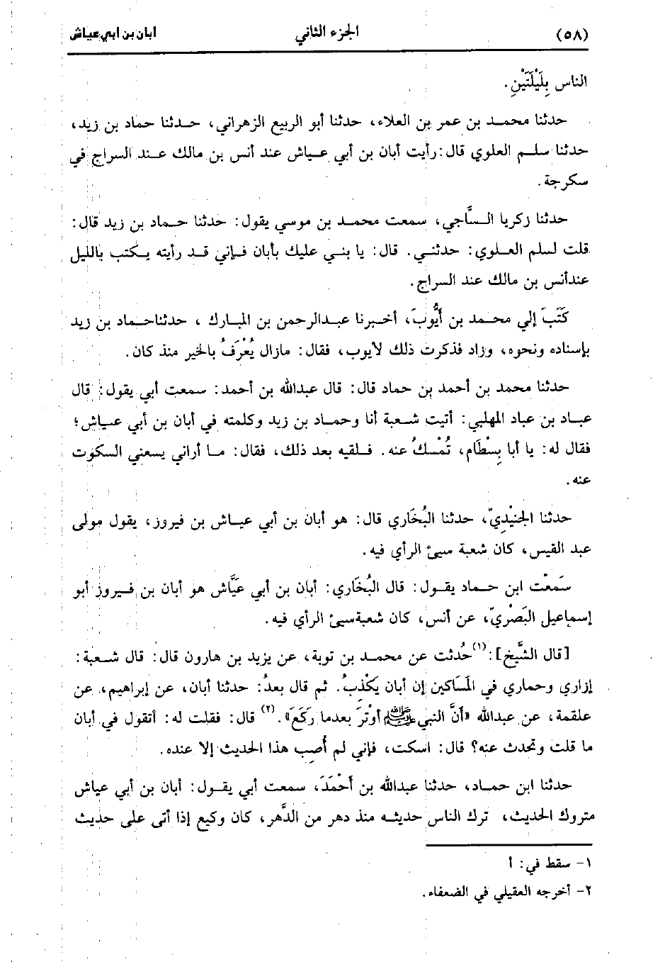 حَدَّثَنَا زكريا الساجي سَمِعْتُ مُحَمد بْن مُوسَى يَقُولُ، حَدَّثَنا حَمَّاد بْن زيد، قالَ: قُلتُ لسلم العلوي، حَدَّثني قَالَ يا بني عليك بأبان فإني قد رأيته يكتب بالليل عند أنس بْن مَالِك عند السراج.