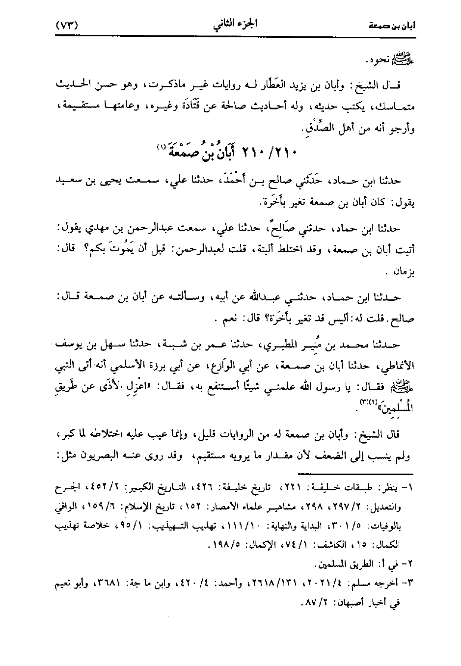 حَدَّثَنَا ابْن حماد، حَدَّثني صالح، حَدَّثَنا علي سَمِعْتُ عَبد الرَّحْمَنِ بْنَ مَهْدِيٍّ يَقُولُ أتيت أَبَان بْن صمعة وقد اختلط البتة قلت لعبد الرَّحْمَنِ قبل أن يموت بكم قَالَ بزمان.