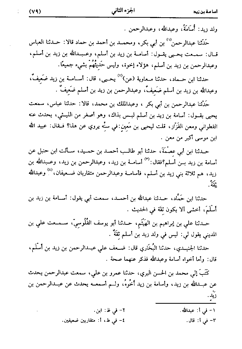 حَدَّثَنَا ابْن أَبِي عصمة، حَدَّثَنا أبو طالب أحمد بن حميد سألت بن حنبل عن أسامة بن زيد بْن أسلم فَقَالَ أسامة بْن زيد، وَعَبد الرَّحْمَنِ بْن زيد، وَعَبد اللَّه بْن زيد هو ثلاثة بني زيد بْن أسلم فأسامة، وَعَبد الرَّحْمَنِ متقاربان ضعيفان، وَعَبد اللَّه ثقة.