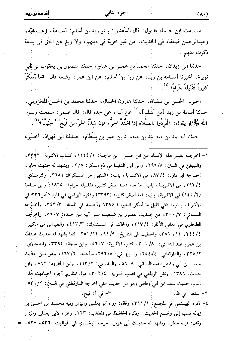 حَدَّثَنَا ابْنُ زَيْدَانَ، حَدَّثَنا مُحَمد بْنُ عُمَر بْنِ هَيَّاجٍ، حَدَّثَنا مَنْصُورُ بْنُ يَعْقُوبَ بْنِ أَبِي نُوَيْرَةَ، أَخْبَرنا أُسَامَةُ بْنُ زَيْدٍ عَنْ زَيْدِ بْنِ أَسْلَمَ، عنِ ابْنِ عُمَر رَفَعَهُ قَال: مَا أَسْكَرَ كَثِيرُهُ فَقَلِيلُهُ حَرَامٌ.