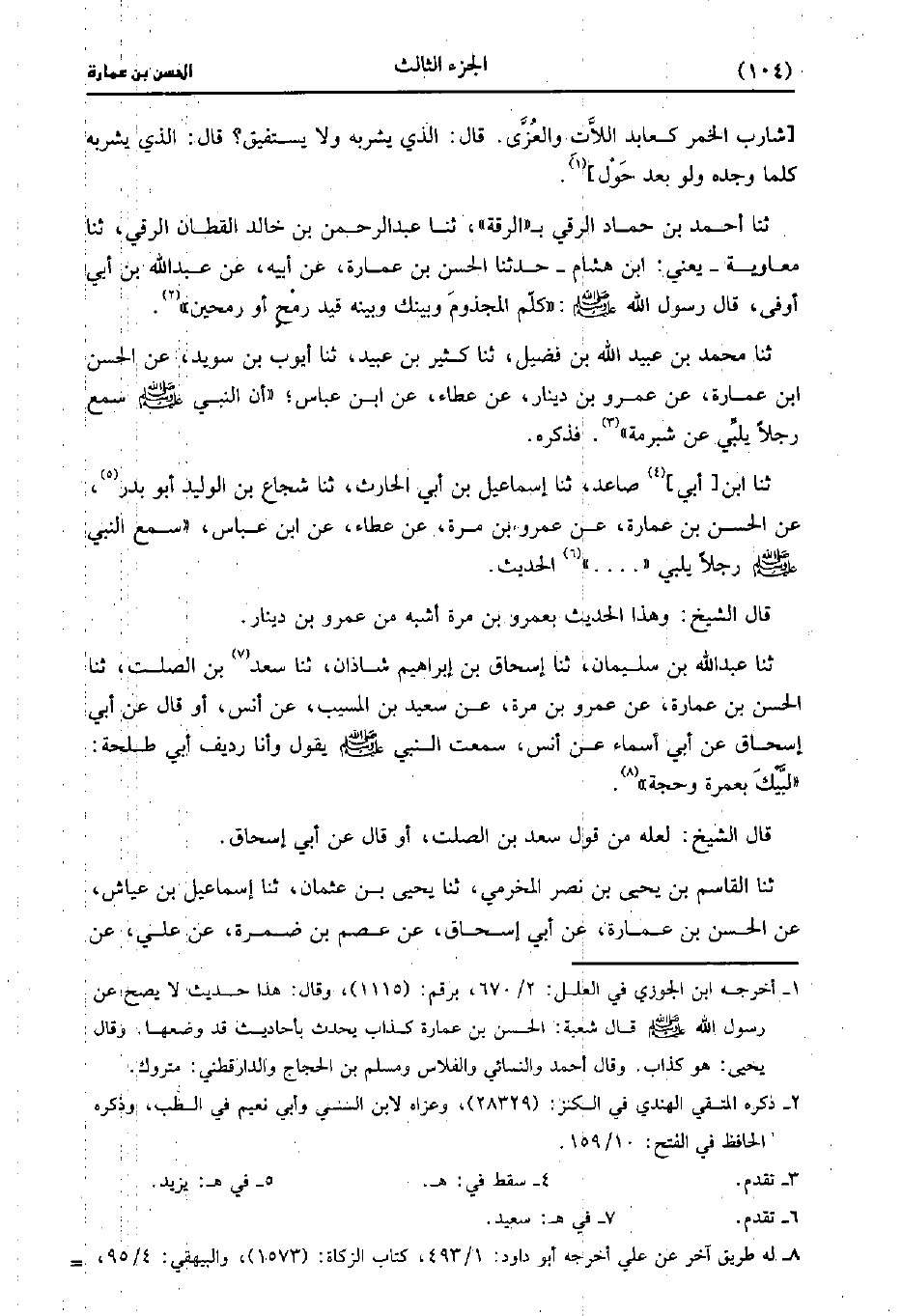 حَدَّثَنَا أَحْمَدُ بْنُ حَمَّادٍ الرَّقِّيُّ بالرقة، حَدَّثَنا عَبد الرَّحْمَنِ بْن خالد القطان الرقي، حَدَّثَنا مُعَاوِيَةُ يَعني ابْنَ هِشَامٍ، حَدَّثَنا الْحَسَنِ بْنِ عُمَارَةَ، عَنْ أَبِيهِ عَنْ عَبد اللَّهِ بْنِ أَبِي أَوْفَى قَال رَسُول اللهِ صَلَّى اللَّهُ عَلَيهِ وَسلَّمَ كَلِّمِ الْمَجْذُومَ وَبَيْنَكَ وَبَيْنَهُ قَيْدُ رُمْحٍ أَوْ رمحين.