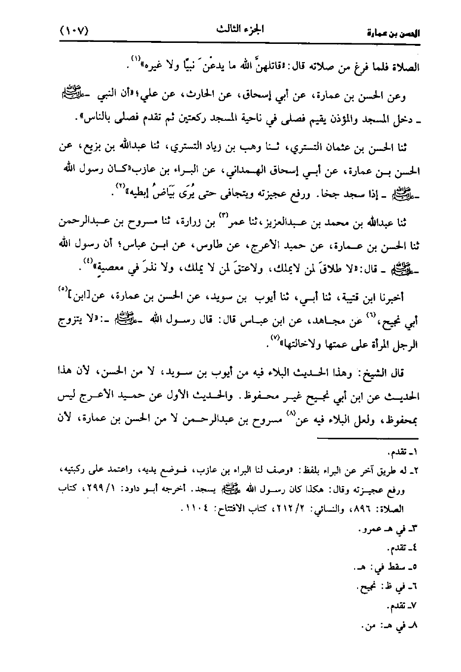 قَالَ الشَّيْخُ: وَهَذَا الْحَدِيثُ الْبَلاءُ فِيهِ مِنْ أَيُّوبَ بْنِ سُوَيْدٍ لا مِنَ الْحَسَنِ لأَن هَذَا الْحَدِيثَ، عنِ ابْنِ أَبِي نَجِيحٍ غَيْرُ مَحْفُوظٍ وَالْحَدِيثُ الأَوَّلُ عَنْ حُمَيْدٍ الأَعْرَجِ لَيْسَ بِمَحْفُوظٍ وَلَعَلَّ الْبَلاءَ فِيهِ عَنْ مَسْرُوحِ بْنِ عَبد الرَّحْمَنِ لا مِنَ الْحَسَنِ بن عمارة لأن
