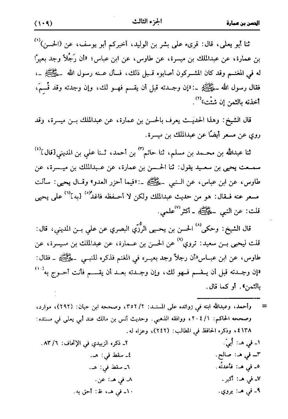 حَدَّثَنَا أَبُو يَعْلَى قَالَ قُرِئَ عَلَى بِشْرِ بْنِ الْوَلِيدِ أَخْبَرَكُمْ أَبُو يُوسُفَ عَنِ الْحَسَنِ بْنِ عُمَارَةَ عَنْ عَبد الْمَلِكِ بْنِ مَيْسَرَةَ عن طاووس، عنِ ابْنِ عَبَّاسٍ، أَنَّ رَجُلا وَجَدَ بَعِيرًا لَهُ فِي الْمَغْنَمِ وَقَدْ كَانَ الْمُشْرِكُونَ أَصَابُوهُ قَبْلَ ذَلِكَ فَسَأَلَ عَنْهُ رَسُولَ اللَّهِ صَلَّى اللَّهُ عَلَيْهِ وَسَلَّمَ فَقَالَ رَسُولِ اللَّهِ صَلَّى اللَّهُ عَلَيْهِ وَسَلَّمَ: أَنَّ وَجَدْتَهُ قَبْلَ أَنْ يُقَسَّمَ فَهُوَ لَكَ، وَإِنْ وَجَدْتَهُ وَقَدْ قُسِّمَ أَخَذْتَهُ بِالثَّمَنِ إِنْ شِئْتَ.