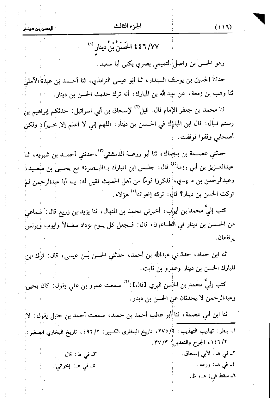 حَدَّثَنَا ابن حماد، حَدَّثني عَبد الله بن أحمد، حَدَّثني الحسن بن عيسى قال: ترك ابن المُبَارك الحسن بن دينار، وعَمْرو بن ثابت.