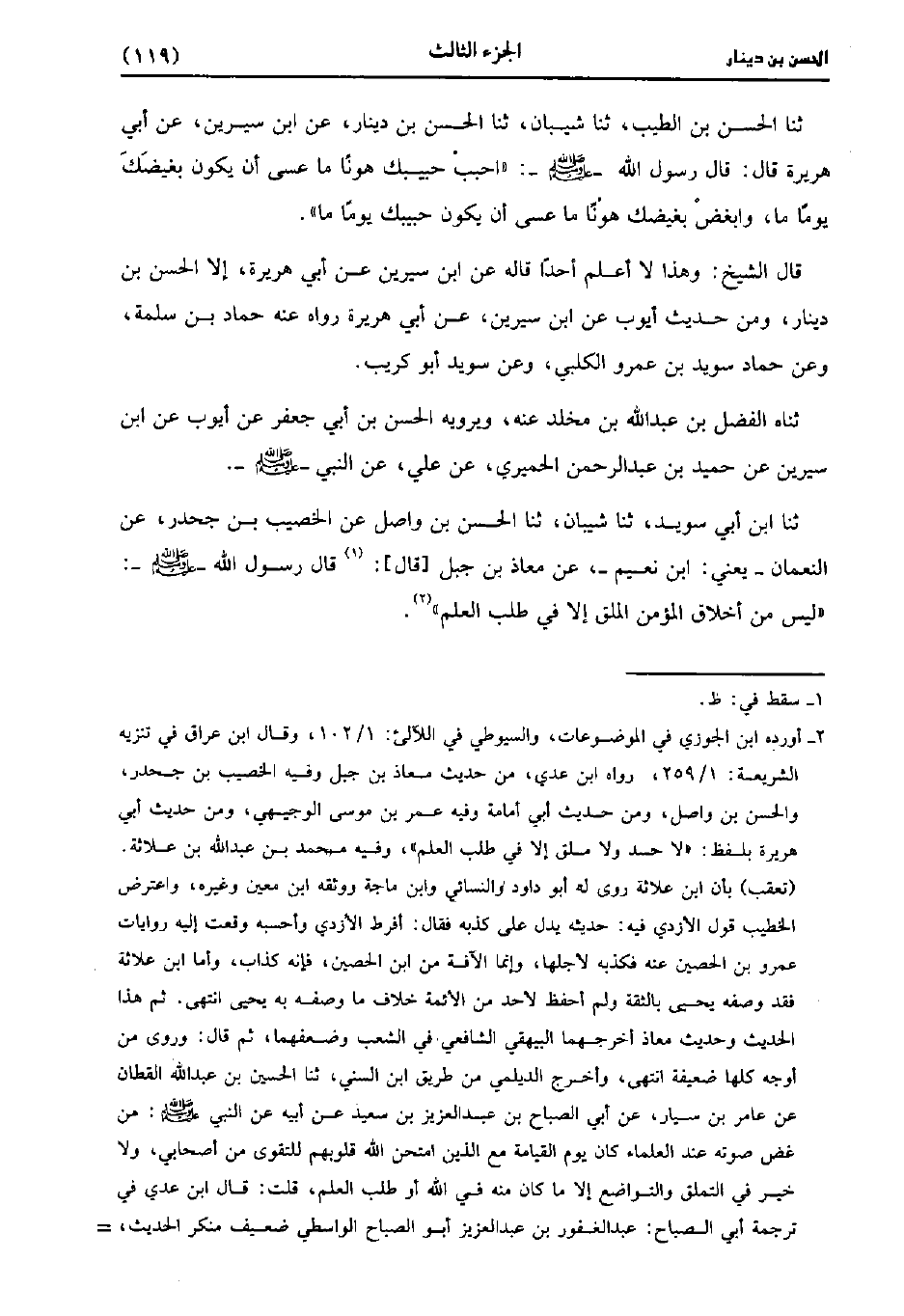 حَدَّثَنَا الحسن بن الطيب، حَدَّثَنا شيبان، حَدَّثَنا الْحَسَنُ بْنُ دِينَارٍ، عنِ ابْنِ سِيرِين، عَن أَبِي هُرَيْرَةَ، قَال: قَال رَسُولُ اللَّهِ صَلَّى اللَّهُ عَلَيْهِ وَسَلَّمَ أحبب حبيبك هَوْنًا مَا عَسَى أَنْ يَكُونَ بَغِيضَكَ يَوْمًا مَا وَابْغِضْ بَغِيضَكَ هَوْنًا مَا عَسَى أَنْ يَكُونَ حَبِيبَكَ يَوْمًا مَا.