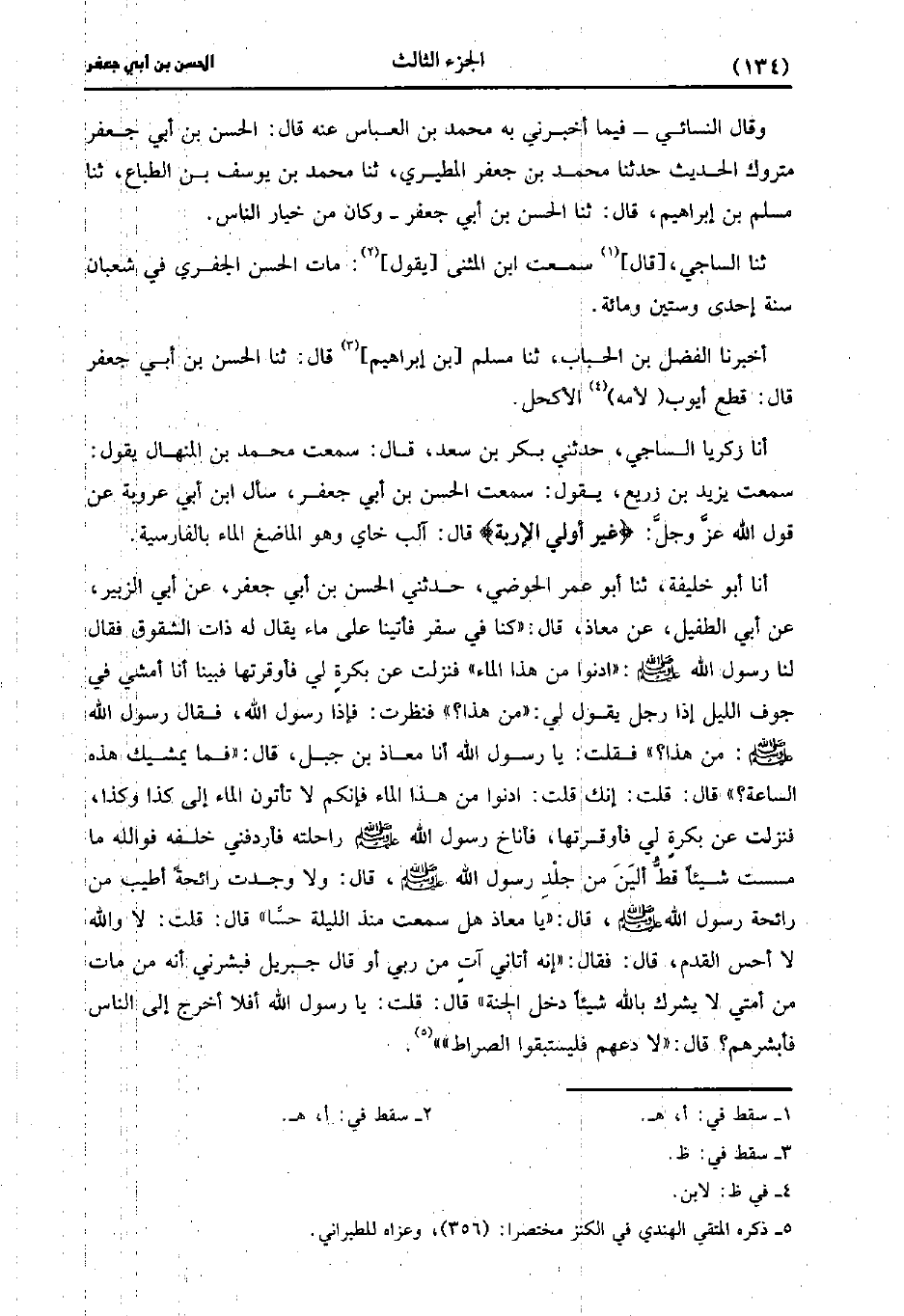 أخبرنا أبو خليفة، حَدَّثَنا أَبُو عُمَر الْحَوْضِيُّ، حَدَّثني الْحَسَنُ بْنُ أَبِي جَعْفَرٍ، عَن أَبِي الزُّبَيْرِ، عَن أَبِي الطُّفَيْلِ عَنْ مُعَاذٍ قَال: كُنا فِي سَفَرٍ فَأَتَيْنَا عَلَى مَاءٍ، يُقَال لَهُ: ذَاتُ الشُّقُوقِ فَقَالَ لَنَا رَسُولُ اللَّهِ صَلَّى اللَّهُ عَلَيْهِ وَسَلَّمَ ادْنُوا مِنْ هَذَا الْمَاءِ فَنَزَلْتُ عَنْ بَكْرَةٍ لِي فَأَوقَرْتُهَا فَبَيْنَا أَنَا أَمْشِي فِي جَوْفِ اللَّيْلِ إِذَا رَجُلٌ يَقُولُ لِي مَنْ هَذَا فَنَظَرْتُ فَإِذَا رَسُولُ اللَّهِ صَلَّى اللَّهُ عَلَيْهِ وَسَلَّمَ فَقَالَ رَسُولِ اللَّهِ صَلَّى اللَّهُ عَلَيْهِ وَسَلَّمَ مَنْ هَذَا فَقُلْتُ يَا رَسُولَ اللهِ أَنَا مُعَاذُ بْنُ جَبَلٍ قَالَ فَمَا يُمْشِيكَ هَذِهِ السَّاعَةَ، قالَ: قُلتُ إِنَّكَ قُلْتَ ادْنُوا مِنْ هَذَا الْمَاءِ فَإِنَّكُمْ لا تَأْتُونَ الْمَاءَ إِلَى كَذَا وَكَذَا فَنَزَلْتُ عَنْ بَكْرَةٍ لِي فَأَوْقَرْتُهَا فَأَنَاخَ رَسُولُ اللَّهِ صَلَّى اللَّهُ عَلَيْهِ وَسَلَّمَ رَاحِلَتَهُ فَأَرْدَفَنِي خَلْفَهُ فَوَاللَّهِ مَا مَسَسْتُ شَيْئًا قَطُّ أَلْيَنَ مِنْ جِلْدِ رَسُولِ اللَّهِ صَلَّى اللَّهُ عَلَيْهِ وَسَلَّمَ صَلَّى اللَّهُ عَلَيه وسَلَّم قَال: ولاَ وَجَدْتُ رَائِحَةً أَطْيَبَ مِنْ رَائِحَةِ رَسُولِ اللَّهِ صَلَّى اللَّهُ عَلَيْهِ وَسَلَّمَ صَلَّى اللَّهُ عَلَيه وسَلَّم قَال: يَا مُعَاذُ هَلْ سَمِعْتَ مُنْذُ اللَّيْلَةِ حِسًّا، قالَ: قُلتُ لا وَاللَّهِ لا أَحِسُّ الْقَدَمَ، قَال: فَقال إِنَّهُ أَتَانِي آتٍ مِنْ رَبِّي أَوْ قَالَ جِبْرِيلُ فَبَشَّرَنِي أَنُّهُ مَنْ مَاتَ مِنْ أُمَّتِي لا يُشْرِكُ بِاللَّهِ شَيْئًا دَخَلَ الْجَنَّةَ، قالَ: قُلتُ يَا رَسُولَ اللهِ أَفَلا أَخْرُجُ إِلَى النَّاسِ فَأُبَشِّرَهُمْ؟ قَال: لاَ دَعْهُمْ فَلْيَسْتَبِقُوا الصراط