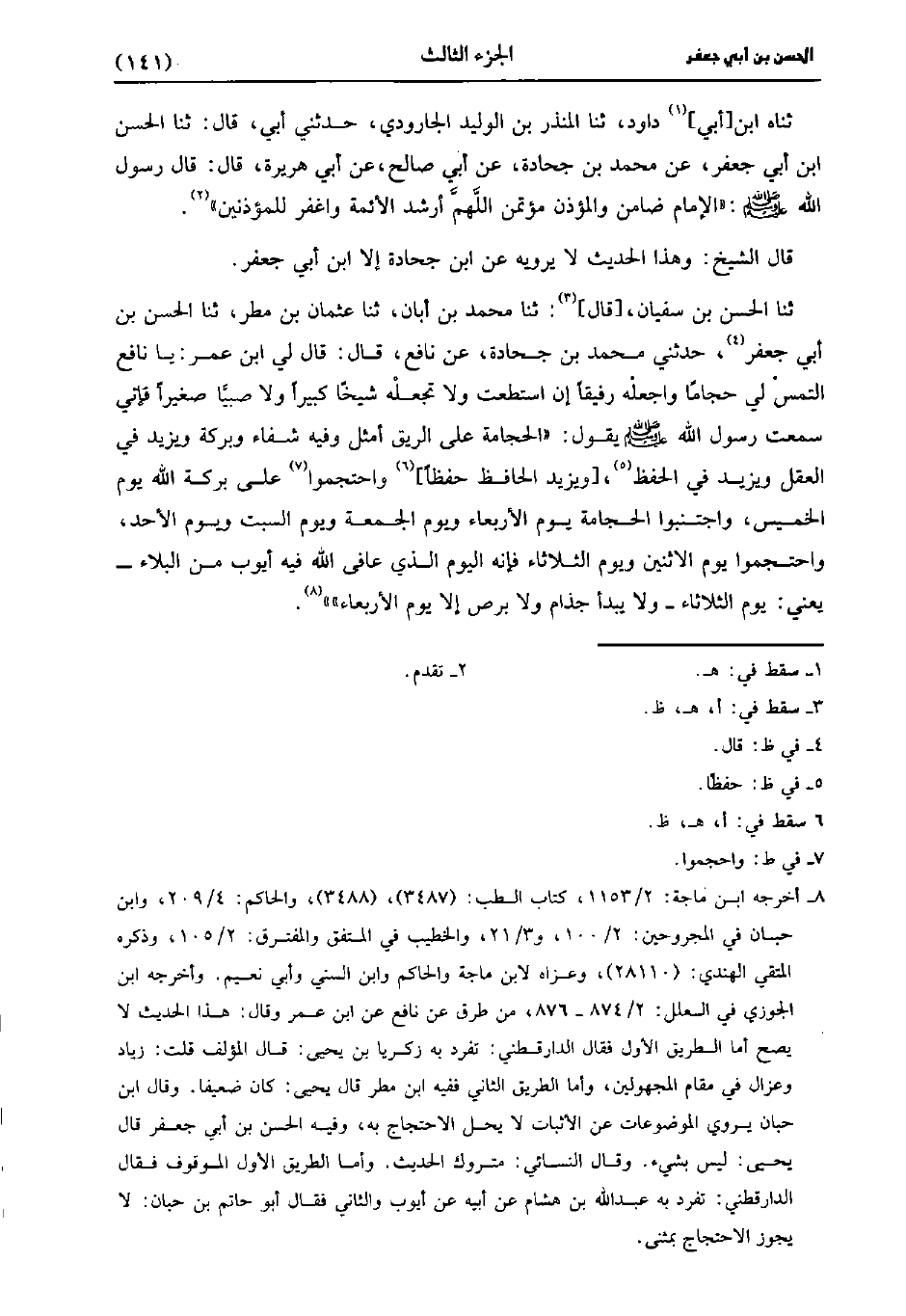 حَدَّثَنَا الْحَسَنُ بْنُ سُفْيَانَ، قَال: حَدَّثَنا مُحَمد بْنُ أَبَان، حَدَّثَنا عثمان بن مطر، حَدَّثَنا الْحَسَنُ بْنُ أَبِي جَعْفَرٍ، حَدَّثني مُحَمد بْنُ جُحَادَةَ عَنْ نافع، قَال: قَال لي بن عُمَر يَا نَافِعُ الْتَمِسْ لِي حَجَّامًا وَاجْعَلْهُ رَفِيقًا إِنِ اسْتَطَعْتَ، ولاَ تَجْعَلْهُ شَيْخًا كَبِيرًا، ولاَ صَبِيًّا صَغِيرًا فَإِنِّي سَمِعْتُ رَسُولَ اللَّهِ صَلَّى اللَّهُ عَلَيْهِ وَسَلَّمَ يَقُولُ الْحِجَامَةُ عَلَى الرِّيقِ أَمْثَلُ وَفِيهِ شِفَاءٌ وَبَرَكَةٌ وَيَزِيدُ فِي الْعَقْلِ وَيَزِيدُ فِي الْحِفْظِ وَيَزِيدُ الحافظ حفظا واحجموا عَلَى بَرَكَةِ اللَّهِ يَوْمَ الْخَمِيسِ وَاجْتَنِبُوا الْحِجَامَةَ يَوْمَ الأَرْبَعَاءِ وَيَوْمَ الْجُمُعَةِ وَيَوْمَ السَّبْتِ وَيَوْمَ الأَحَدِ وَاحْتَجِمُوا يَوْمَ الاثْنَيْنِ وَيَوْمَ الثُّلاثَاءِ فَإِنَّهُ الْيَوْمَ الَّذِي عَافَى اللَّهُ فِيهِ أَيُّوبَ مِنَ الْبَلاءِ يَعْنِي يَوْمَ الثُّلاثَاءِ، ولاَ يَبْدَأُ جُذَامٌ، ولاَ بَرَصٌ إِلا يَوْمَ الأَرْبِعَاءِ