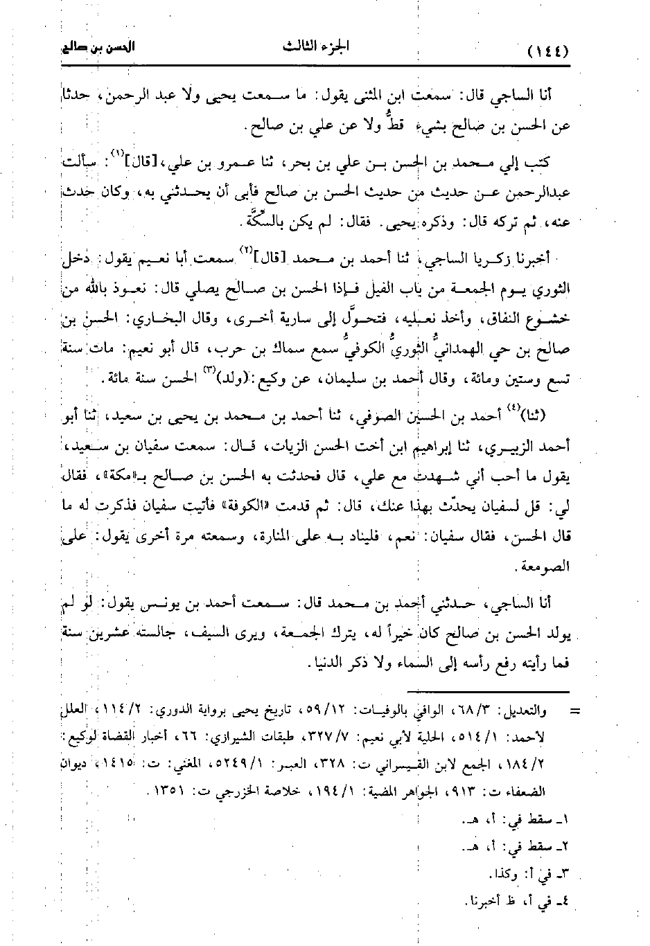 حَدَّثَنَا زكريا الساجي، حَدَّثَنا أحمد بن مُحَمد، قَالَ: سَمِعْتُ أبا نعيم يقول دخل الثَّوْريّ يوم الجمعة من باب الفيل فإذا الحسن بن صالح يصلي قال نعوذ بالله من خشوع النفاق وأخذ نعليه فتحول إلى سارية أخرى وقال البُخارِيّ الحسن بن صالح بن حي الهمداني الثَّوْريّ الكوفي سمع سماك بن حرب قَالَ أَبُو نعيم مات سنة تسع وستين ومِئَة وقال أحمد بن سليمان عن وكيع ولد الحسن سنة مِئَة.