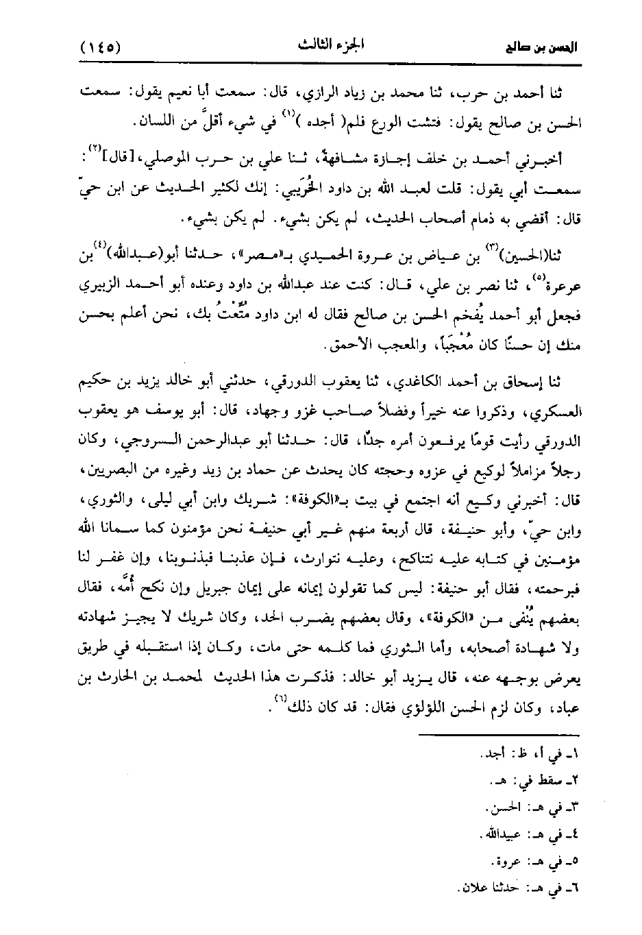 حَدَّثَنَا الحسين بن عياض بن عروة الحميدي بمصر، حَدَّثَنا أبو عَبد الله بن عرعرة، حَدَّثَنا نصر بن علي قَال: كنتُ عند عَبد الله بن داود وعنده أبو أحمد الزبيري فجعل أبو أحمد يفخم الحسن بن صالح فقال له بن داود متعت بك نحن أعلم بحسن منك إن حسنا كان معجبا والمعجب الاحمق.
