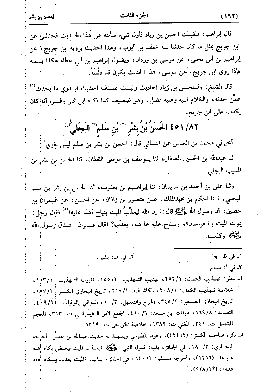 حَدَّثَنَا عَبد اللَّهِ بْنُ الْحُسَيْنِ الصَّفَّارُ، حَدَّثَنا يُوسُفُ بْنُ مُوسَى الْقَطَّانُ، حَدَّثَنا الحسن بن بشر بن المُسَيَّب البجلي (ح) وَحَدَّثَنَا عَلِيُّ بْنُ أَحْمَدَ بْنِ سليمان، حَدَّثَنا إبراهيم بن يعقوب، حَدَّثَنا الحسن بن بشر بن سلم البجلي، حَدَّثَنا الْحَكَمُ بْنُ عَبد الْمَلِكِ عَنْ مَنْصُورِ بْنِ زَاذَانَ عَنِ الْحَسَنِ، عَن عِمْرَانَ بْنِ حُصَيْنٍ، أَن رسُول اللَّهِ صَلَّى اللَّهُ عَلَيهِ وَسلَّمَ، قَال: إِنَّ اللَّهَ لَيُعَذِّبُ الْمَيْتَ بِنِيَاحِ أَهْلِهِ عَلَيْهِ فَقَالَ رَجُلٌ يَمُوتُ الْمَيِّتُ بِخُرَاسَانَ ويناح عليه هَاهُنا يُعَذَّبُ فَقَالَ عِمْرَانَ صَدَقَ رَسُولُ اللَّهِ صَلَّى اللَّهُ عَلَيْهِ وَسَلَّمَ وكذبت