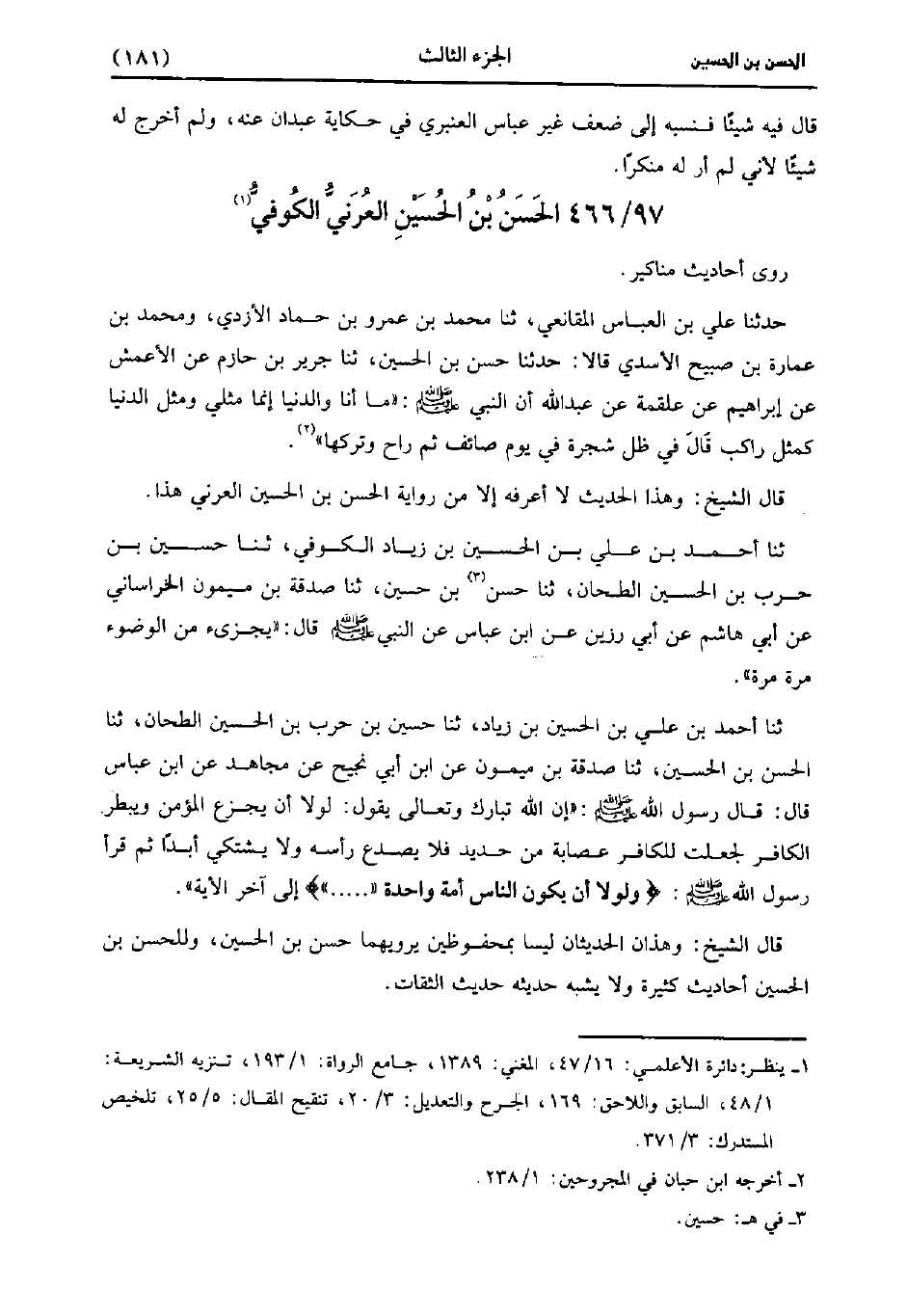 حَدَّثَنَا عَلِيُّ بْنُ الْعَبَّاسِ الْمُقَانِعِيُّ، حَدَّثَنا مُحَمد بْنُ عَمْرو بْنِ حَمَّادٍ الأَزْدِيُّ، وَمُحمد بْنُ عُمَارَةَ بْنُ صُبَيْحٍ الأَسَدِيُّ، قَالا: حَدَّثَنا حسن بن الحسين، حَدَّثَنا جَرِيرُ بْنُ حَازِمٍ، عَنِ الأَعْمَش عَنْ إِبْرَاهِيمَ عَنْ عَلْقَمَةَ عَنْ عَبد اللَّهِ، أَن النَّبيّ صَلَّى اللَّهُ عَلَيه وسَلَّم قَال: مَا أَنَا وَالدُّنْيَا إِنَّمَا مِثْلِي وِمِثْلُ الدُّنْيَا كَمِثْلِ رَاكِبٍ قَالَ فِي ظِلِّ شَجَرَةٍ فِي يَوْمٍ صَائِفٍ ثُمَّ رَاحَ وَتَرَكَهَا.