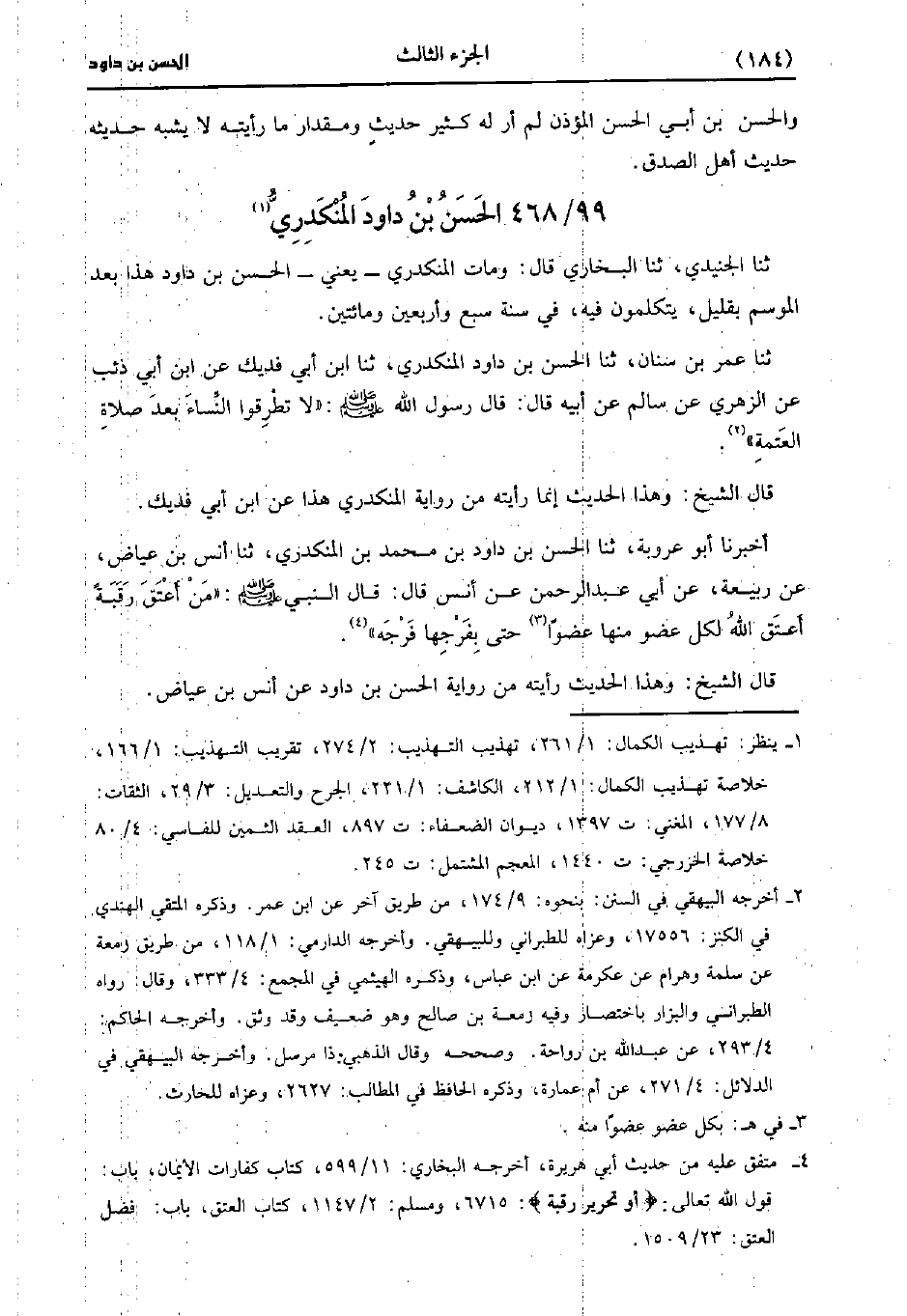 حَدَّثَنَا أبو عَرُوبة، حَدَّثَنا الْحَسَنُ بْنُ دَاوُدَ بْنِ مُحَمد بن المنكدري، حَدَّثَنا أَنَسُ بْنُ عِيَاضٍ عَنْ رَبِيعَةَ، عَن أَبِي عَبد الرَّحْمَنِ، عَن أَنَس، قَال: قَال النَّبِيُّ صَلَّى اللَّهُ عَلَيهِ وَسلَّمَ مِنَ أَعْتَقَ رَقَبَةً أَعْتَقَ اللَّهُ لِكُلِّ عُضْوٍ مِنْهَا عُضْوًا حَتَّى بِفَرْجِهَا فَرْجَهُ.