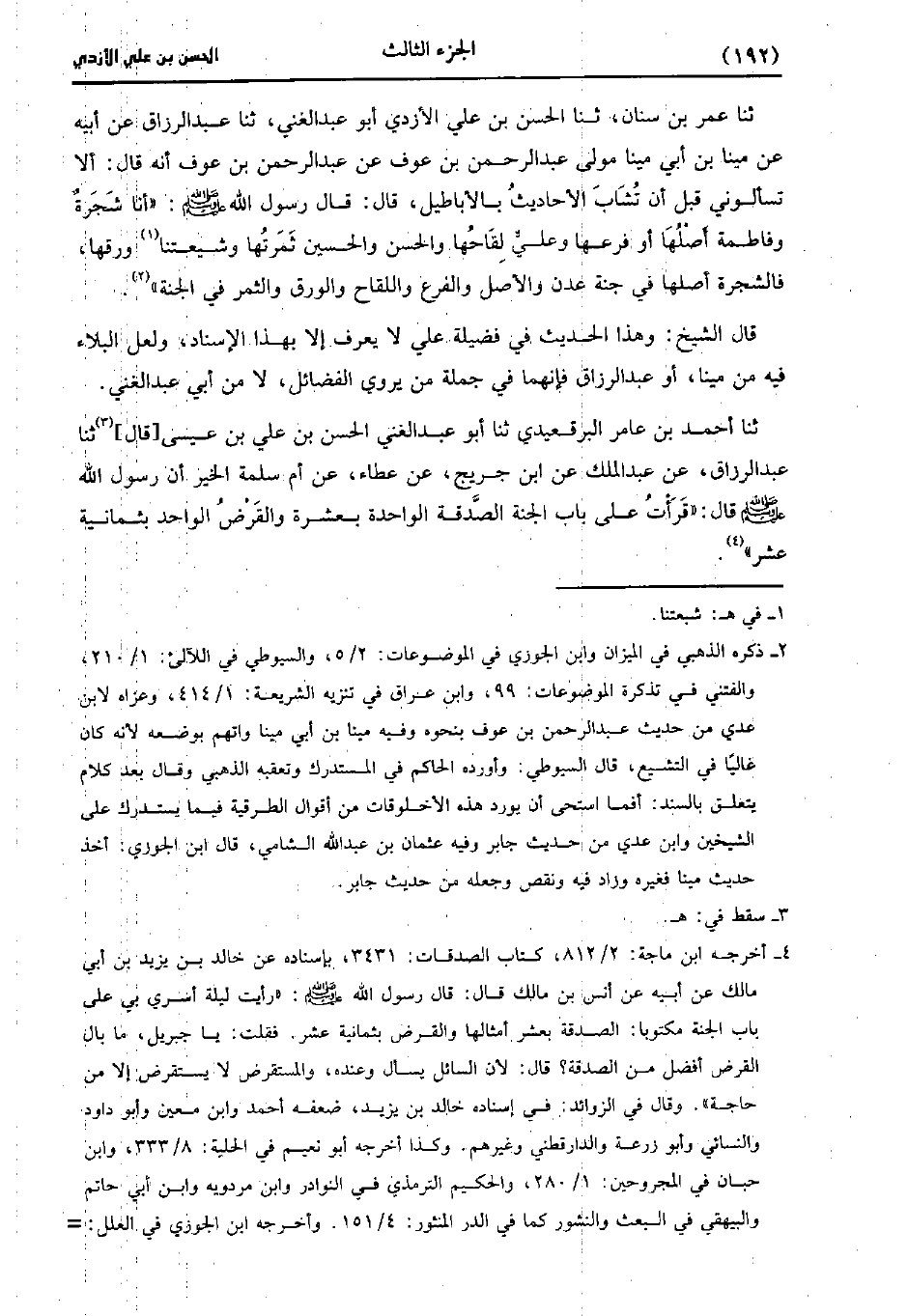 قَالَ الشَّيْخُ: وَهَذَا الْحَدِيثُ فِي فَضِيلَةِ عَلِيٍّ لا يعرف إلا بهذا الإسناد وَلَعَلَّ الْبَلاءَ فِيهِ مِنْ مِينَا أَوْ عَبد الرَّزَّاق فَإِنَّهُمَا فِي جُمْلَةِ مَنْ يَرْوِي الْفَضَائِلِ لا من أبي عَبد الغني، حَدَّثَنا أَحْمَدُ بْنُ عَامِرٍ الْبَرْقَعِيدِيُّ، حَدَّثَنا أَبُو عَبد الْغَنِيِّ الْحَسَنُ بْنُ علي بن عيسى، قَال: حَدَّثَنا عَبد الرَّزَّاق عَنْ عَبد الْمَلِكِ، عنِ ابْنِ جُرَيج، عَن عَطاء، عَن أُمِّ سَلَمَةَ الْخَيْرِ، أَن رسُول اللَّهِ صَلَّى اللَّهُ عَلَيه وسَلَّم قَال: قَرَأْتُ عَلَى بَابِ الْجَنَّةِ الصَّدَقَةُ الْوَاحِدَةُ بِعَشْرَةٍ وَالْقَرْضُ الواحد بثمانية عشر