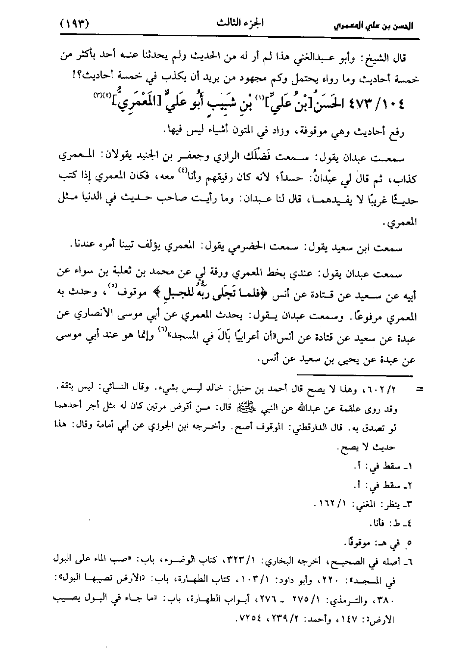 سمعت عبدان يقول عندي بخط المعمري ورقة لي عن مُحَمد بن ثعلبة بن سواء، عن أبيه عن سَعِيد، عَن قَتادَة، عَن أَنَس فلما تجلى ربه للجبل موقوف وحدث به المعمري مرفوعا وسمعت عبدان يقول يحدث المعمري، عَن أبي موسى الأنصاري عن عبدة عن سَعِيد، عَن قَتادَة، عَن أَنَس أَنَّ أعرابيا بال في المسجد، وإِنَّما هو عند أبي موسى عن عبدة، عَن يَحْيى بن سَعِيد عن أنس