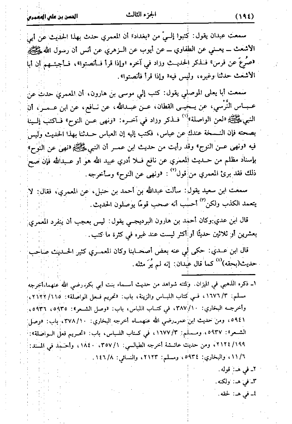 سمعت أبا يعلى الموصلي يقول كتب إلي موسى بن هارون أن المعمري حَدَّث عَن عباس النرسي، عَن يَحْيى القطان عن عَبد الله عَنْ نَافِعٍ، عنِ ابْنِ عُمَر، أَن النَّبيّ صَلَّى اللَّهُ عَلَيهِ وَسلَّمَ لعن الواصلة فذكر وزاد في آخره ونهى عن النوح فاكتب إلينا بصحته فإن النسخة عندك، عَن عباس فكتب إليه إن العباس، حَدَّثَنا بهذا الحديث وليس فيه ونهى عن النوح وقد رأيت من حديث بْنِ عُمَر، أَن النَّبيّ صَلَّى اللَّهُ عَلَيهِ وَسلَّمَ نَهَى عَنْ النوح بإسناد مظلم من حديث المعمري عن نافع فلا أدري عُبَيد الله هو أو عَبد الله فإن صح ذلك فقد بريء المعمري من قول ونهى عن النوح وسأخرجه.
