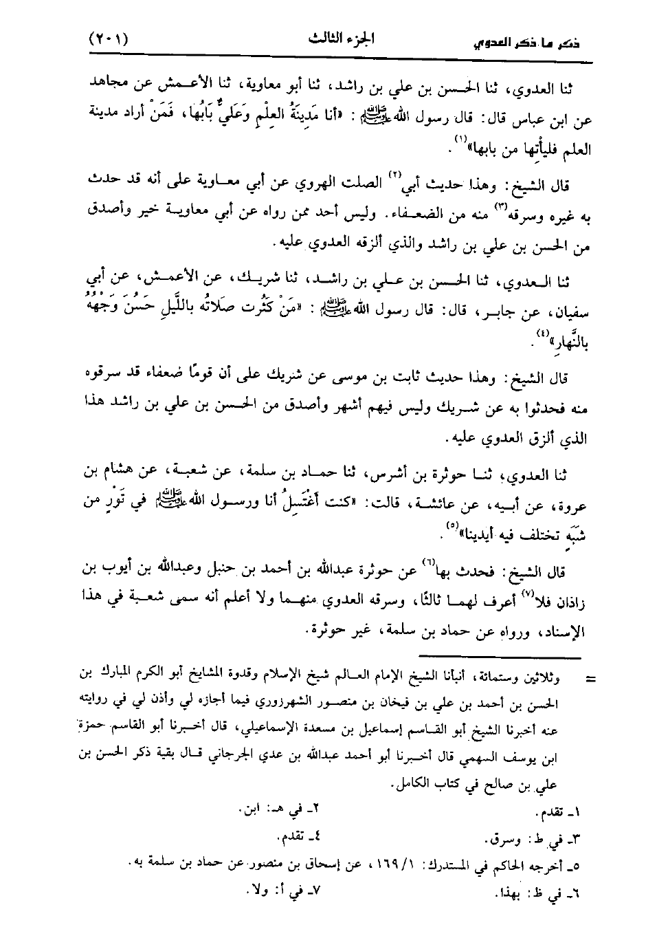 حَدَّثَنَا العدوي، حَدَّثَنا الْحَسَنُ بْنُ عَلِيِّ بْنِ راشد، حَدَّثَنا أَبُو مُعَاوِيَةَ، حَدَّثَنا الأَعْمَش عَنْ مُجَاهِدٍ، عنِ ابْنِ عَبَّاسٍ، قَال: قَال رَسُولُ اللَّهِ صَلَّى اللَّهُ عَلَيْهِ وَسَلَّمَ أَنَا مَدِينَةُ الْعِلْمِ، وَعلي بَابِهَا فَمَنْ أَرَادَ مَدِينَةَ الْعِلْمِ فَلْيَأْتِهَا مِنْ بَابِهَا.