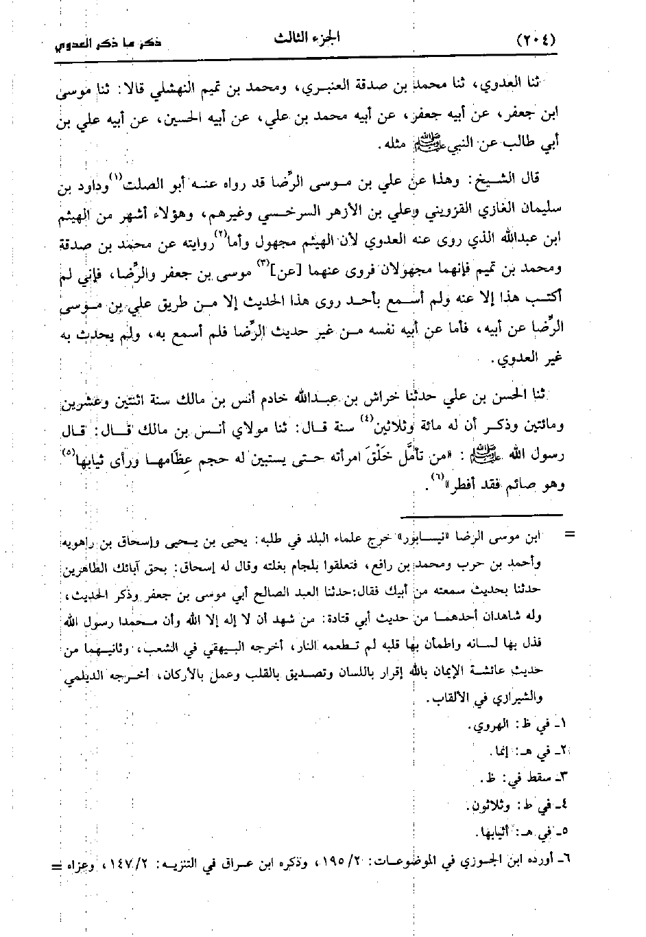 قَالَ الشَّيْخُ: وَهَذَا عَنْ عَلِيِّ بْنِ مُوسَى الرِّضَا قَدْ رَوَاهُ عَنْهُ أَبُو الصَّلْتِ وَدَاوُدُ بْنُ سُلَيْمَانُ الْغَازِيُّ الْقِزْوِينِيُّ، وَعلي بْنُ الأَزْهَرِ السَّرَخْسِيُّ وَغَيْرُهُمْ وَهَؤُلاءِ أَشْهَرُ مِنَ الْهَيْثَمِ بْنِ عَبد اللَّهِ الَّذِي رَوَى عَنْهُ الْعَدَوِيُّ لأَن الْهَيْثَمَ مَجْهُولٌ.