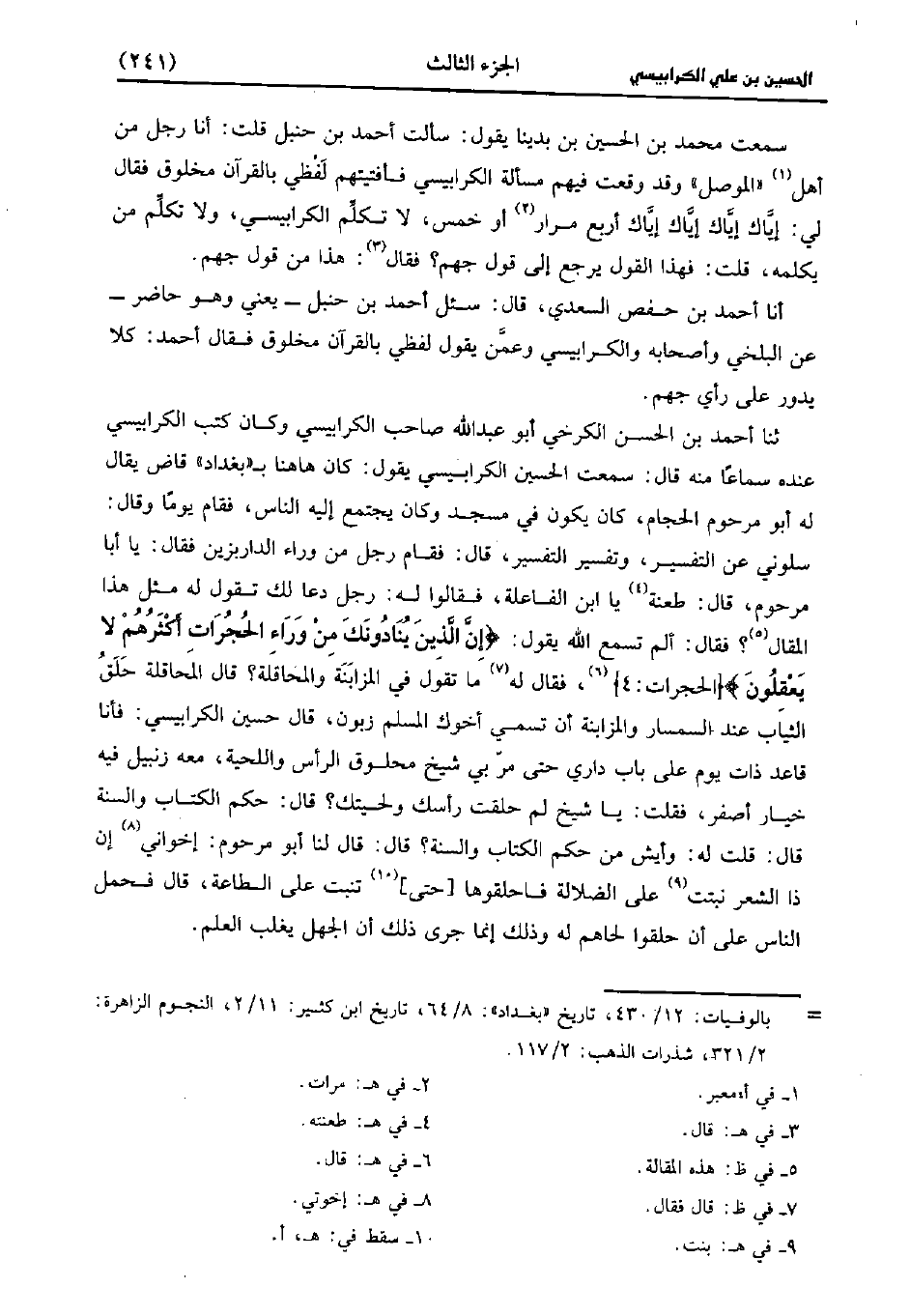 سَمِعْتُ مُحَمد بْنَ الْحُسَيْنِ بْنِ بدينا يقولُ: سَألتُ أحمد بن حنبل قلت أنا رجل من أهل الموصل وقد وقعت فيهم مسألة الكرابيسي فأفتيتهم لفظي بالقرآن مخلوق فقال لي إياك إياك إياك إياك أربع مرار أو خمس لا تكلم الكرابيسي، ولاَ تكلم من يكلمه قلت فهذا القول يرجع إلى قول جهم فقال هذا من قول جهم.