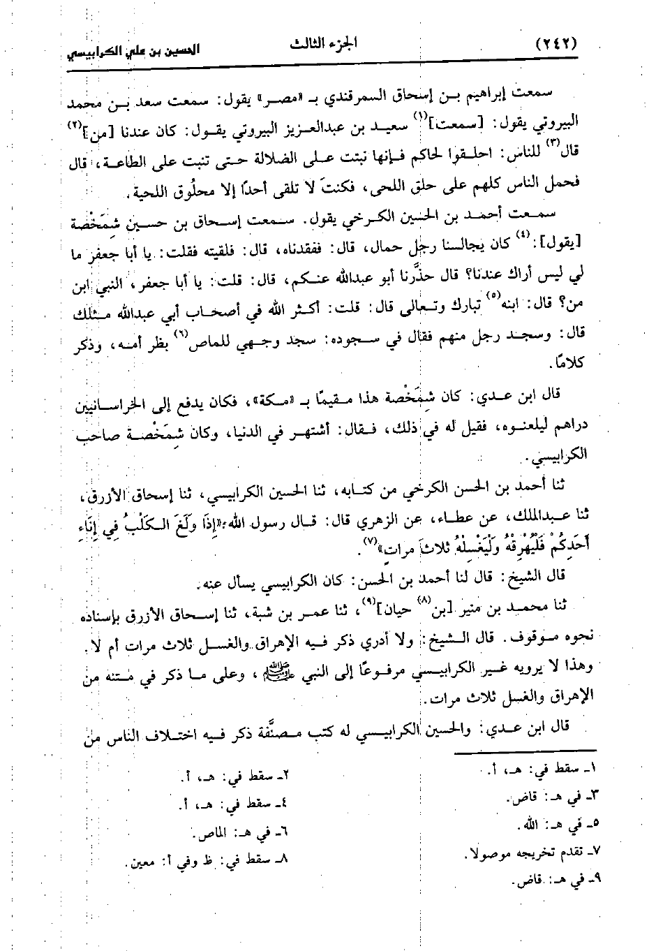 قال ابنُ عَدِي، وَالحُسَين الكرابيسي له كتب مصنفة ذكر فيها اختلاف الناس من