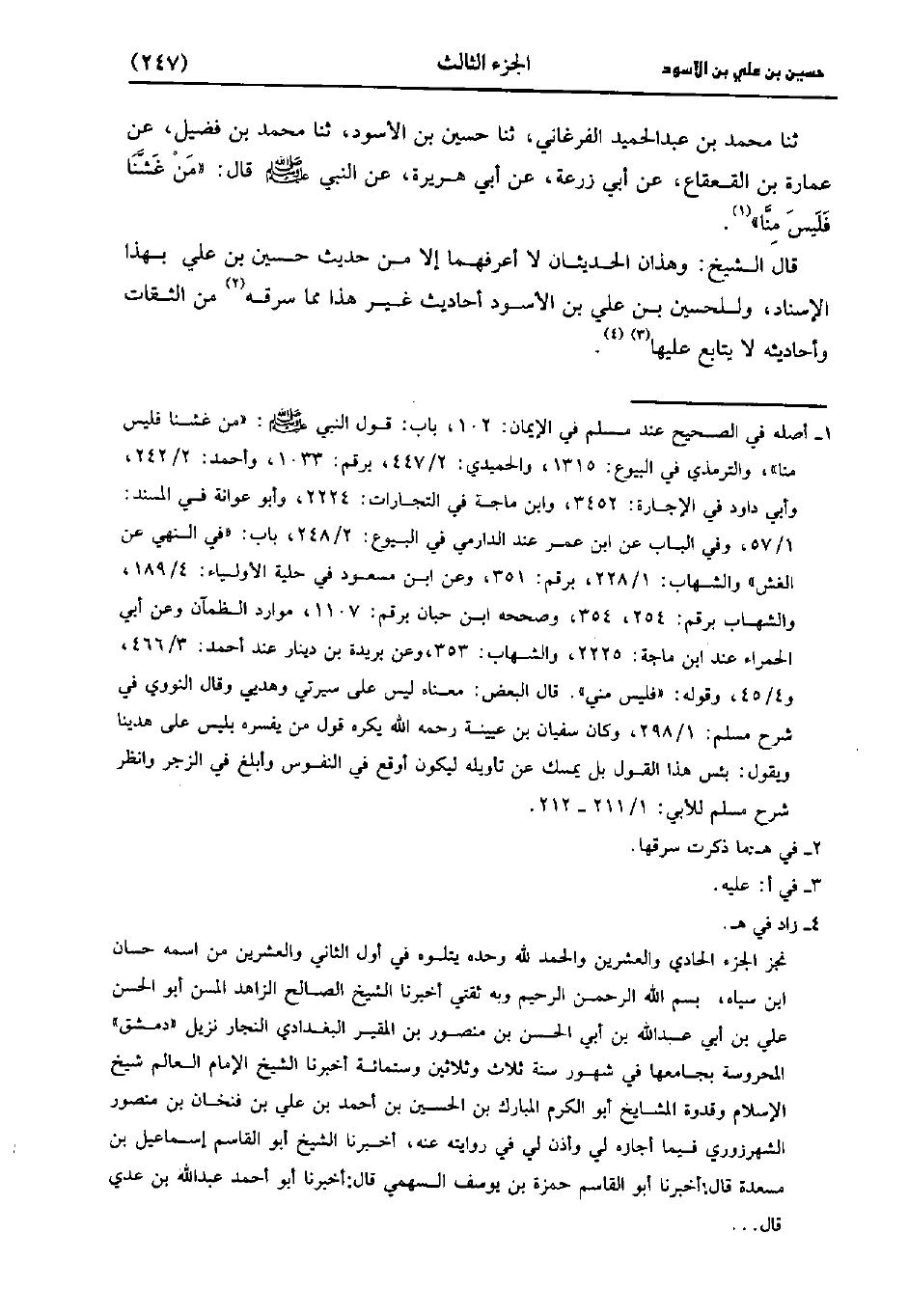 حَدَّثَنَا مُحَمد بْنُ عَبد الْحَمِيدِ الفرغاني، حَدَّثَنا حسين بن الأوسد، حَدَّثَنا مُحَمد بْنُ فُضَيْلٍ عَنْ عُمَارَةَ بْنِ الْقَعْقَاعِ، عَن أَبِي زُرْعَة، عَن أَبِي هُرَيْرَةَ عَنِ النَّبِيُّ صَلَّى اللَّهُ عَلَيه وسَلَّم قَال: مَنْ غَشَّنَا فَلَيْسَ مِنَّا.