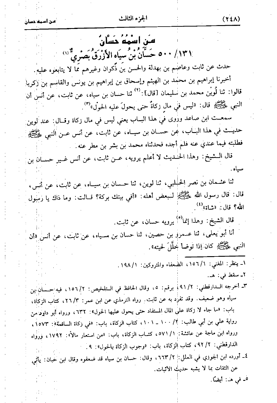 سمعتُ ابن صاعد وروى في هذا الباب يعني ليس في مال زكاة وقال عند لوين حديث في هذا الباب عن حسان بن سياه عَنْ ثَابِتٍ، عَن أَنَس عَنِ النَّبِيُّ صَلَّى اللَّهُ عَلَيهِ وَسلَّمَ فطلبته فيما عندي عنه فلم أجده فحدثناه مُحَمد بن بشر بن مطر عنه.