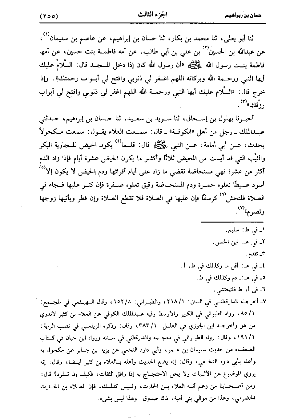 حَدَّثَنَا بَهْلُولُ بْنُ إِسْحَاقَ، حَدَّثَنا سُوَيْدٌ بن سَعِيد، حَدَّثَنا حَسَّانُ بْنُ إِبْرَاهِيمَ، حَدَّثني عَبد الْمَلِكِ رَجُلٌ مِنْ أَهْلِ الْكُوفَةِ، قَالَ: سَمِعْتُ الْعَلاءَ يَقُولُ: سَمعتُ مَكْحُولا يُحَدِّثُ، عَن أَبِي أُمَامَةَ عَنِ النَّبِيِّ صَلَّى اللَّهُ عَلَيه وسَلَّم قَال: قَلَّمَا يَكُونُ الْحَيْضُ لِلْجَارِيَةِ الْبِكْرِ وَالثَّيِّبِ الَّتِي قَدْ أَيِسَتْ مِنَ الْمَحِيضِ ثَلاثًا وَأَكْثَرُ مَا يَكُونُ الْحَيْضُ عَشْرَةَ أَيَّامٍ فَإِذَا زَادَ الدَّمُّ أَكْثَرَ مِنْ عَشْرَةٍ فَهِيَ مُسْتَحَاضَةٌ تَقْضِي مَا زَادَ عَلَى أَيَّامِ إِقْرَائِهَا وَدَمُّ الْحَيْضِ لا يَكُونُ إلاَّ أَسْوَدَ عَبِيطًا تَعْلُوهُ حُمْرَةٌ وَدَمُّ الْمُسْتَحَاضَةِ رَقِيقٌ تَعْلُوهُ صُفْرَةٌ فَإِنْ كَثُرَ عَلَيْهَا فَجَاءَ فِي الصَّلاةِ فَلْتَحْشِ كرسفا فإن غلبلها فِي الصَّلاةِ فَلا تَقْطَعِ الصَّلاةَ، وَإِنْ قَطَرَ وَيَأْتِيهَا زَوْجُهَا وَتَصُومُ