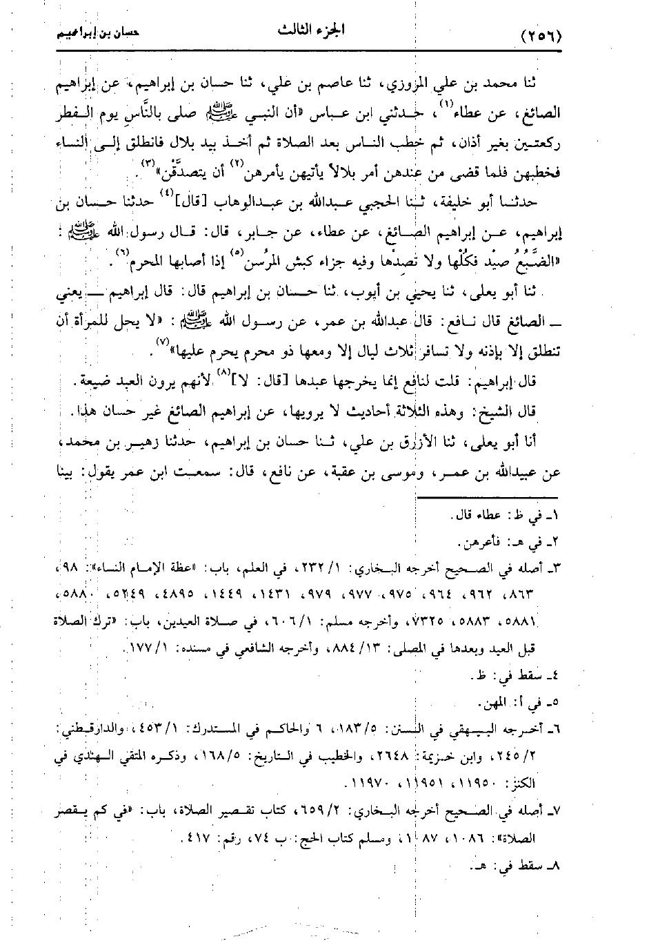 حَدَّثَنَا مُحَمد بن علي المروزي، حَدَّثَنا عَاصِمُ بْنُ عَلِيٍّ، حَدَّثَنا حَسَّانُ بْنُ إِبْرَاهِيمَ عَنْ إِبْرَاهِيمَ الصَّائِغُ عَنْ عَطَاءٍ، حَدَّثني ابْنُ عَبَّاسٍ أَنَّ النَّبِيَّ صَلَّى اللَّهُ عَلَيهِ وَسلَّمَ صَلَّى بِالنَّاسِ يَوْمَ الْفِطْرِ رَكْعَتَيْنِ بِغَيْرِ أَذَانٍ ثُمَّ خَطَبَ النَّاسَ بَعْدَ الصَّلاةِ ثُمَّ أَخَذَ بِيَدِ بِلالٍ فَانْطَلَقَ إِلَى النِّسَاءِ فَخَطَبَهُنَّ فَلَمَّا قَضَى مِنْ عِنْدِهِنَّ أَمَر بِلالا يَأْتِيْهِنَّ يَأْمُرُهُنَّ أَنْ يَتَصَدَّقْنَ.